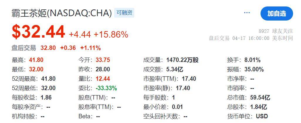 瑞财经 吴文婷1月8日,有消息称,中国茶饮连锁品牌霸王茶姬正考虑在香港上市,相关知情人士表示,霸王茶姬已就上市计划与投资银行展开初步沟通, 融资金额或达数亿美元,可能今年进行。相关磋商仍在进行中,也可能决定不推进香港上市计划。此外,该计划仍需获得监管批准。 对此,霸王茶姬方面回应称,暂无计划。 公开资料显示,霸王茶姬创立于2017年,灵感来源自1970年代以来国际咖啡连锁店如何将喝咖啡变成一种全球生活方式和社会观念。 2025年4月17日,霸王茶姬在纳斯达克上市,成为中国茶饮赴美第一股。截至首日收盘,其报32.44美元,涨15.86%,总市值约59.54亿美元。 如今,截至1月8日发稿时,霸王茶姬报13.37美元,涨2.45%,总市值约24.54亿美元。 | 最高: 41.80 | 今开: 33.75 | 成交量: 1470.22万股 | 换手:8.01% | | --- | --- | --- | --- | | 最低: 32.00 | 昨收:28.00 | 成交额:5.34亿 | 振幅: 35.00% | | 52周最高: 41.80 | 量比: 12.44 | 市盈率(TTM): 17.40 | 市净率 ...