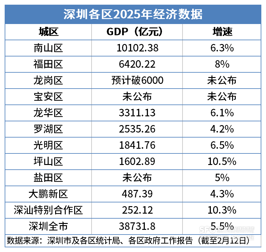 21世纪经济报道记者陈思琦深圳报道 从增速看,除龙岗、宝安暂未公布数据,南山、福田、龙华、光明、坪山、深汕6区跑赢全市。其中,坪山(10.5%)、深汕(10.3%)实现两位数迅猛增长,正 围绕车、药等特定的高附加值方向,谋求产业结构优化升级。 | | 深圳各区2025年经济数据 | | | --- | --- | --- | | 城区 | GDP(亿元) | 増速 | | 南山区 | 10102.38 | 6.3% | | 福田区 | 6420.22 | 8% | | 龙岗区 | 预计破6000 | 未公布 | | 宝安区 | 未公布 | 未公布 | | 龙华区 | 3311.13 | 6.1% | | 罗湖区 | 2535.26 | 4.2% | | 光明区 | 1841.76 | 6.5% | | 坪山区 | 1602.89 | 10.5% | | 哉田区 | 未公布 | 5% | | 大鹏新区 | 487.39 | 4.3% | | 深汕特别合作区 | 252.12 | 10.3% | | 深圳全市 | 38731.8 | G-5.5% FINE | | | 数据来源:深圳市及各区统计局、各区政府工作报 ...