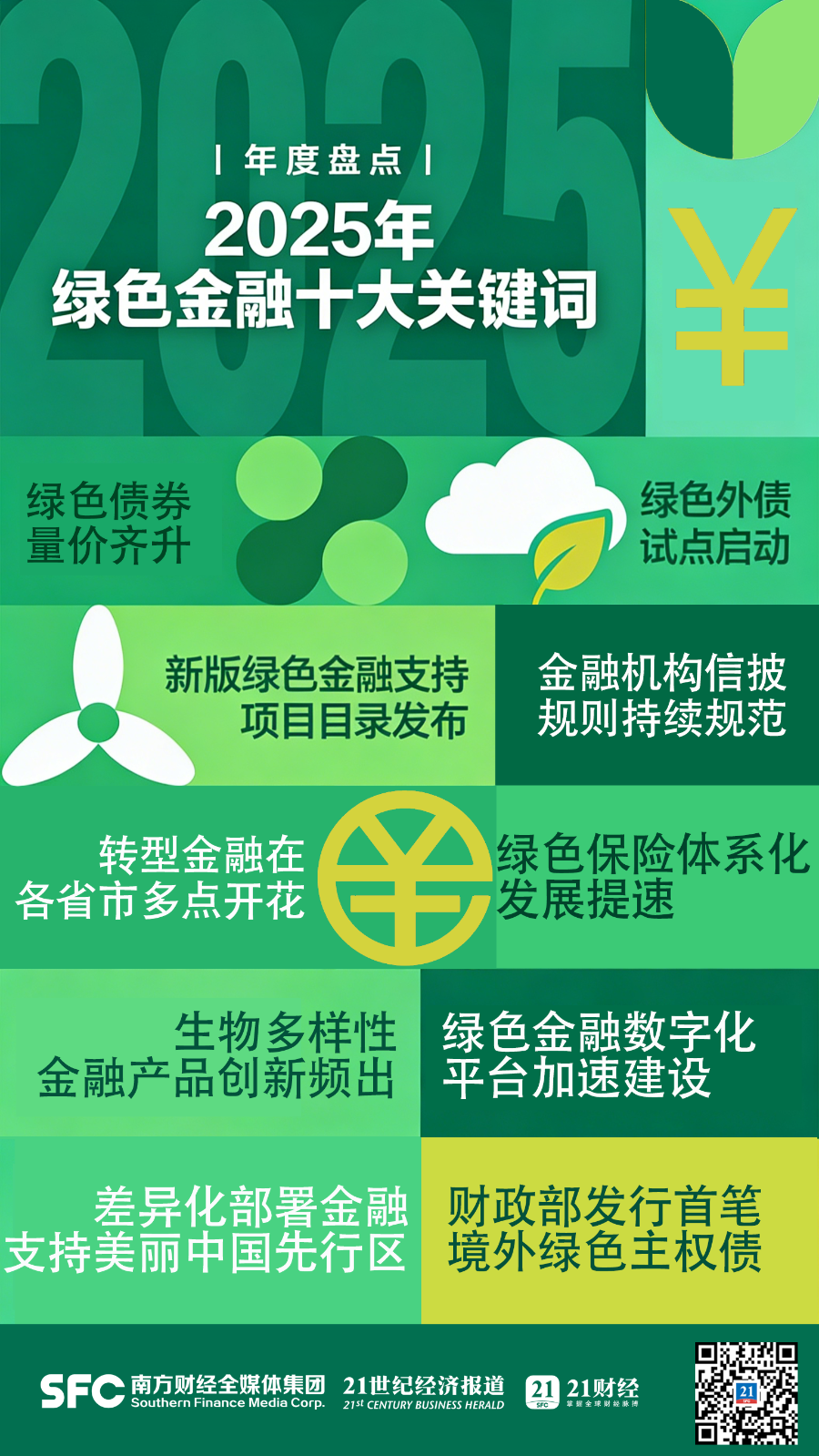 南方财经记者郭晓洁实习生王泽楠广州报道 截至2025年末,中国本外币绿色贷款余额44.77万亿元,全年增加7.72万亿元,在高基数基础上同比实现超过20%的增长,金融 支持绿色发展的力度持续加码,成为推动经济社会发展全面绿色转型的重要力量。 回顾2025年,中国绿色金融发展迈入标准统一、创新深化、开放协同的全新阶段。从顶层制度的持续完善到市场产品的多元突 破,从国内区域的差异化实践到国际领域的深度接轨,金融"活水"精准滴灌绿色低碳发展的脉络清晰可见。 这一年,绿色金融作为"加快经济社会发展全面绿色转型"的重要支撑,被纳入多项重大战略部署。国家层面陆续出台新版绿色 金融支持项目目录、金融机构气候信息披露准则等制度文件;绿色金融对外开放迈出关键步伐,绿色外债试点、境外绿色主权 债券发行,中国绿色金融深度融入全球市场。 同时,行业创新实践实现多方位突破,绿色债券市场量价齐升,创新产品层出不穷,转型金融在各省市多点开花,为高碳行业 低碳转型注入金融动能,生物多样性金融、绿色保险从理念走向规模化实践,科技赋能让绿色金融数字化平台建设提速。 我们梳理了2025年度绿色金融十大关键词,记录金融助力美丽中国建设的关键探索与坚 ...