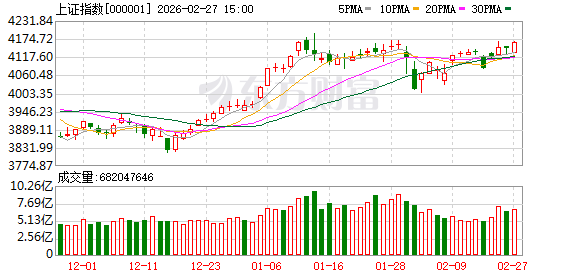 2月27日,三大指数涨跌不一,上证指数收涨0.39%,创业板指跌1.04%。 板块来看,稀有金属概念股掀涨停潮,钢铁、燃气、煤炭、电力、环保涨幅靠前,云计算、AI应用、算力租赁题材活跃。算力硬件、 半导体、商业航天概念股调整。 以沪指为例,本周4个交易日,虽然每天起起伏伏,但其最新收盘点位来到了4162.88点,既是本月的新高,也是今年的次高位——只比 1月12日的4165.29点略低。 而近期我们反复提到的万得全A、全A平均股价两大"全局性"指标,双双于今天创出阶段新高。 | F9 不复权 超级叠加 画线 工具 ⑤ | | 万得全A | | | | | 881001 | | | | --- | --- | --- | --- | --- | --- | --- | --- | --- | --- | | 2025/10/10-2026/02/27(93日) | | 6942 40 | | | | +28.02 +0.41% | | | | | | | SSE 15:00:05 | | | | 沪深市场核心指数 / ■ + | | | | | 6944.52-> | | 全额 | | | | | | | 2. ...