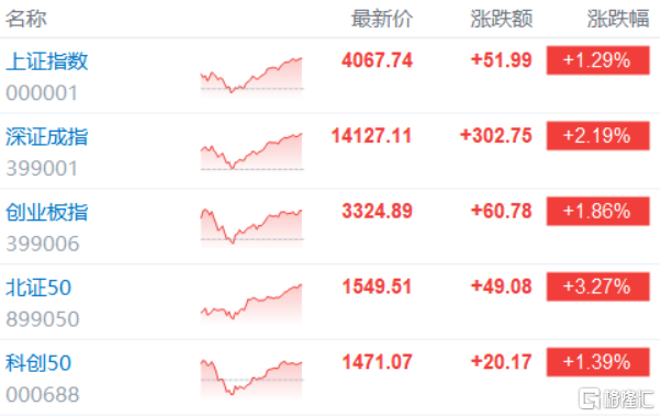 具体来看: 光伏设备板块走强,泽润新能、帝科股份等多股涨停,连城数控涨超18%,晶盛机电、微导纳米、欧普 泰等多股跟涨。 2月3日,A股三大指数早盘走低,午后集体走高;截至收盘,沪指涨1.29%报4067点,深证成指涨 2.19%,创业板指涨1.86%,北证50指数涨3.27%。全市场成交额2.57万亿元,较前一交易日缩量410亿 元,超4800股上涨。 | 名称 | 最新价 | 涨跌额 | 涨跌幅 | | --- | --- | --- | --- | | 上证指数 | 4067.74 | +51.99 | +1.29% | | 000001 | | | | | 深证成指 | 14127.11 | +302.75 | +2.19% | | 399001 | | | | | 创业板指 | 3324.89 | +60.78 | +1.86% | | 399006 | | | | | 北证50 | 1549.51 | +49.08 | +3.27% | | 899050 | | | | | 科创20 | 1471.07 | +20.17 | +1.39% | | 000688 | | | 더해줄[ | 盘面上,光 ...