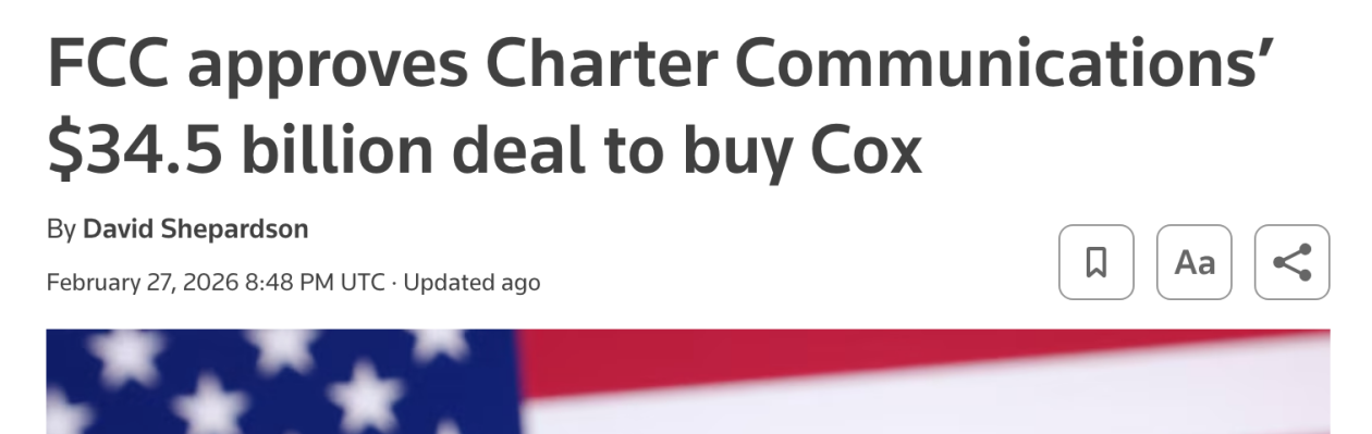 US agency approves Charter Communications' $34.5 billion deal to buy Cox February 27, 20268:48 PM UTCUpdated ago By Reuters Skip to main content Exclusive news, data and analytics for financial market professionalsLearn more aboutRefinitiv United States Federal Communications Commission logo and U.S. flag are seen in this illustration taken April 23, 2025. REUTERS/Dado Ruvic/Illustration Purchase Licensing Rights, opens new tab WASHINGTON, Feb 27 (Reuters) - The Federal Communications Commission said Friday ...