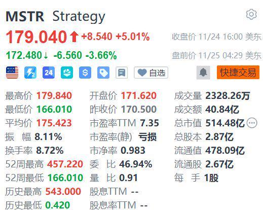 | MSTR Strategy | | | | --- | --- | --- | | 179.040 ↑ +8.540 +5.01% | | 收盘价 11/24 16:00 美东 | | 172.480 + -6.560 -3.66% | | 盘前价 11/25 04:29 美东 | | 一 7 24 4 8 8 日 0 日 2 | | ● 快捷交易 | | 最高价 179.840 | 开盘价 171.620 | 成交量 2328.26万 | | 最低价 166.010 | 昨收价 170.500 | 成交额 40.84亿 | | 平均价 175.423 | 市密率TM 7.35 | 总市值 514.48亿 …) | | 振 幅 8.11% | 市盈率(静) 亏损 | 总股本 2.87亿 | | 换手率 8.72% | 市净率 0.983 | 流通值 478.09亿 | | 52周最高 457.220 委 比 46.94% | | 流通股 2.67亿 | | 52周最低 166.010 量 比 0.91 | | 每 手 1股 | | 历史最高 543.000 股息TM -- | | | | 历史最低 0.4 ...
