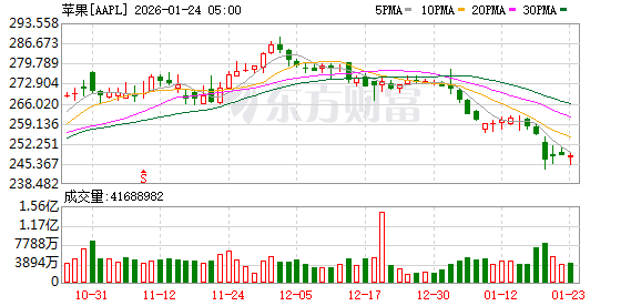 Group 1 - The core viewpoint of the article indicates that Apple's stock price has declined by 1% on January 23, marking a cumulative drop of 3.8% for the week, and it is experiencing its eighth consecutive trading day of decline [1] Group 2 - The article highlights the ongoing downward trend in Apple's stock performance, emphasizing the significance of the consecutive trading days of decline [1]
