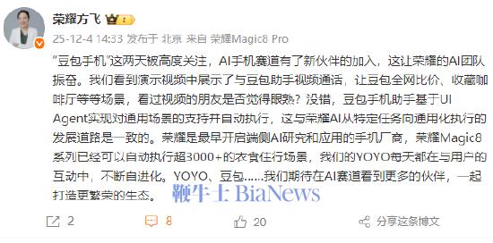 荣耀方飞谈「豆包手机」:AI手机赛道有新伙伴加入,让荣耀AI团队振奋