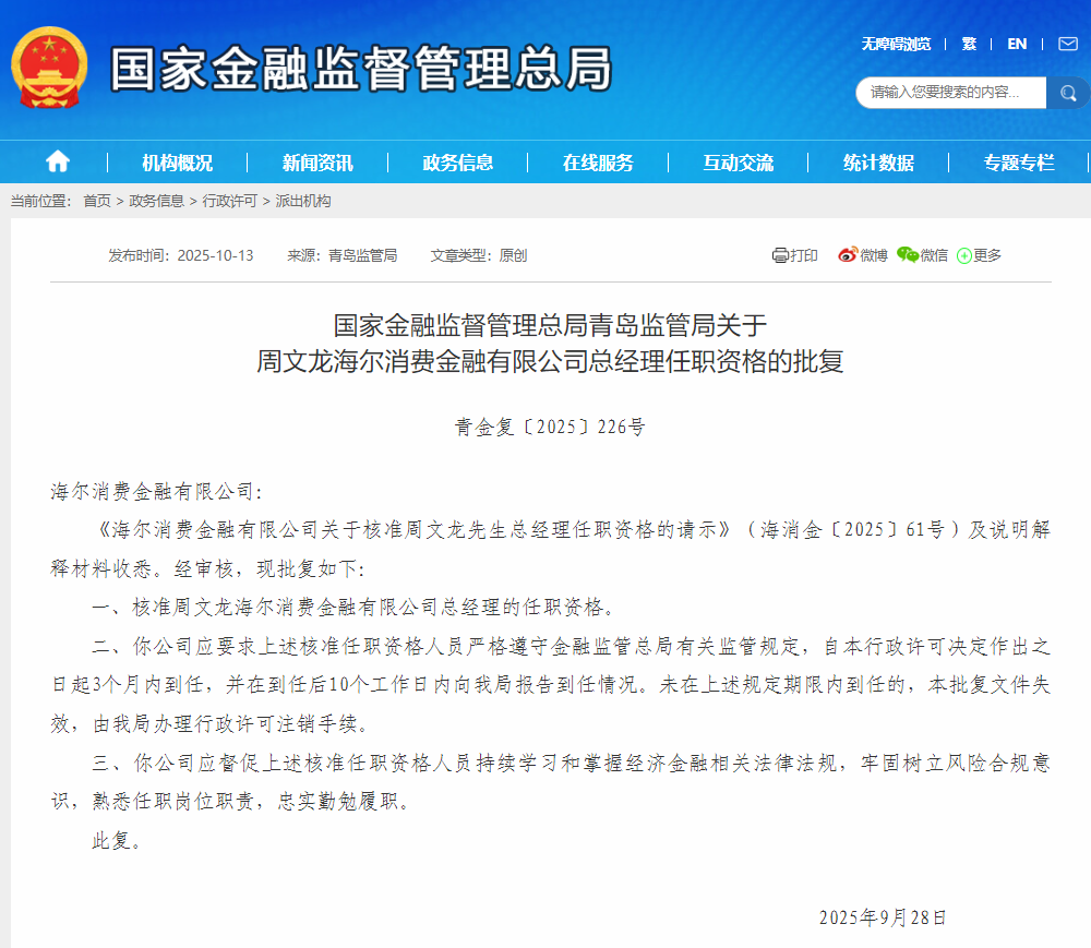 海尔消金迎来新任总经理。 10月13日,国家金融监督管理总局青岛监管局发布两则任职资格批复,核准周文龙海尔消费金融有限公司(简称"海尔消金")总经理、俞文佳 海尔消费金融副总经理的任职资格。 从2015年开始,周文龙离开中信银行总行,开始参与中原消金的筹备建立工作;2016年末中原消金正式获批开业,周文龙出任中原消金总经 理。截至此次任职资格获批前,周文龙在中原消金供职已有10年。在担任中原消金总经理期间,周文龙主导了公司的自营渠道建设与线上渠道 拓展工作,中原消金也是行业内较早接入抖音等流量渠道的公司之一。 在周文龙出任海尔消金第四任总经理前,该职位空缺已超一年。2023年12月,海尔消金原总经理张西铭因家庭原因离职,海尔消金董事长李占 国自2024年6月1日起代为履行总经理职务;到今年4月,监管批复韩祥永担任公司副总经理一职(主持工作)。 对此,海尔消金方面对记者回应称,"周文龙在银行和消费金融行业有多年从业经验,非常欢迎周文龙这样的一流人才加入海尔消金这个年 轻、向上的创业平台,相信他的加入将为公司注入全新的活力。" 海尔消金方面表示,公司将在总经理及现有经营管理团队的带领下稳步发展,聚焦并深化公司"科 ...