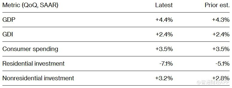 美国经济在第三季度的增长表现略好于初步估计,出口走强以及库存对增长的拖累减轻,为经济扩张提供了 重要支撑。 从分项来看,作为美国经济主要增长引擎的消费者支出在第三季度增长3.5%。其中,服务类支出增速创三年 来最快,商品支出也较上一季度有所加快。企业投资增长3.2%,主要受计算机设备支出持续增长带动;为人 工智能提供基础设施的数据中心投资更是攀升至历史新高。 由于过去一年贸易和库存波动对整体GDP造成一定干扰,经济学家更加关注"私人购买者最终销售指标"这一更 能反映真实需求的指标。该指标在第三季度增长2.9%,与前一季度持平,显示美国内需依旧稳健。 数据还显示,在总统特朗普推出大范围关税政策后,企业在年初为抢在关税生效前集中进口商品,随后逐步 放缓进口节奏。尽管贸易政策反复波动,消费者和企业支出依然保持韧性,对经济形成支撑。 在经济增长强劲、就业市场相对稳定、且通胀水平仍高于目标的背景下,市场普遍预计美联储官员将在下周 的政策会议上维持利率不变。 与此同时,周四公布的另一项数据显示,美国初请失业救济人数仍处于低位,显示劳动力市场保持稳健。 GDP报告还指出,美联储偏好的通胀指标,剔除食品和能源价格的个人消费支 ...