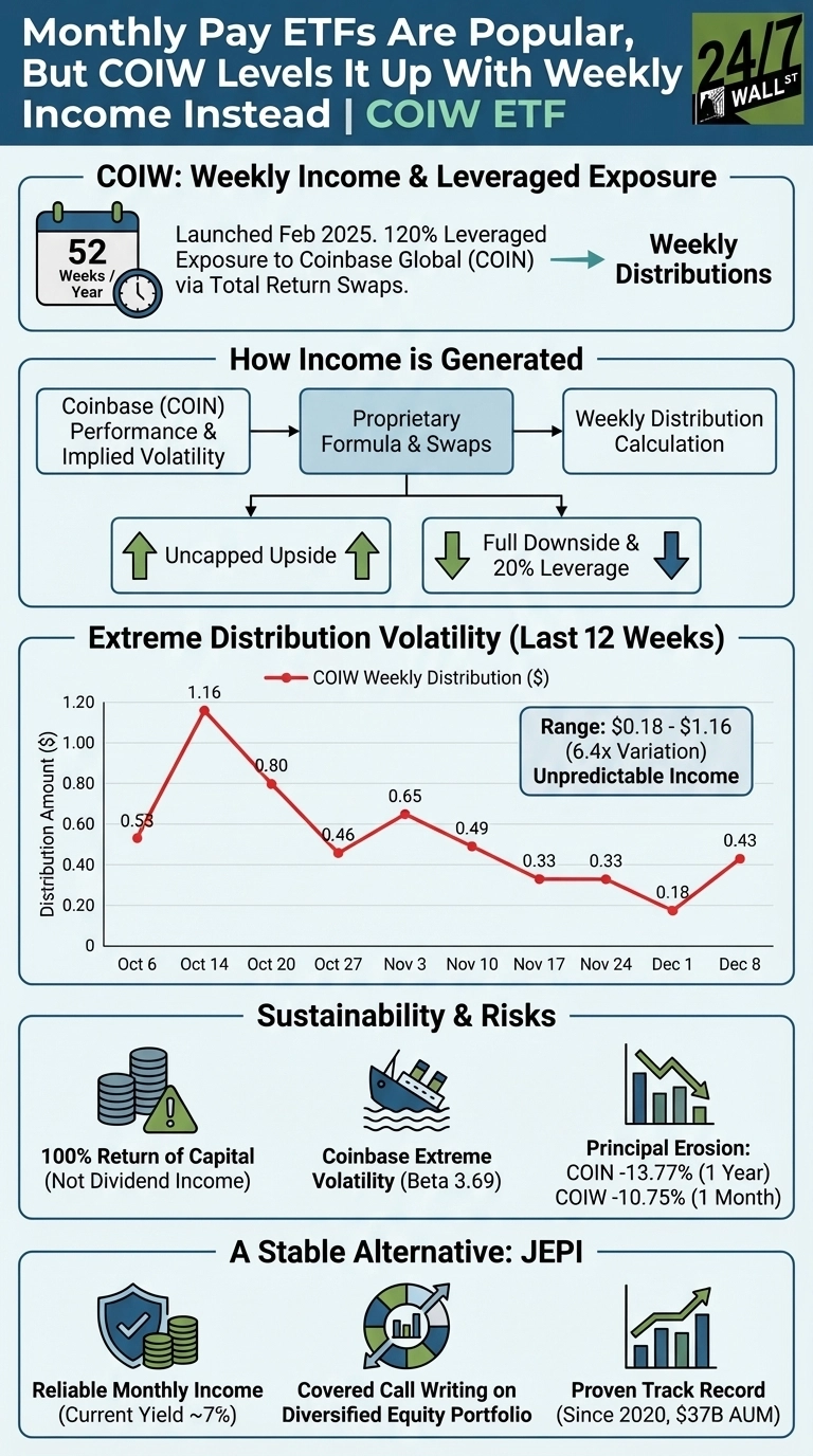 The Roundhill COIN WeeklyPay ETF (NYSEARCA:COIW) offers 52 dividend payments per year, a huge improvement over the quarterly payments of most ETFs, and a newer cohort of monthly yield options. Launched in February 2025, COIW targets weekly distributions while providing 120% leveraged exposure to Coinbase Global (NASDAQ:COIN) through total return swaps. However, more frequent income doesn't mean safer income, and COIW's distribution pattern shows exactly why. For reliable monthly income without extreme volat ...