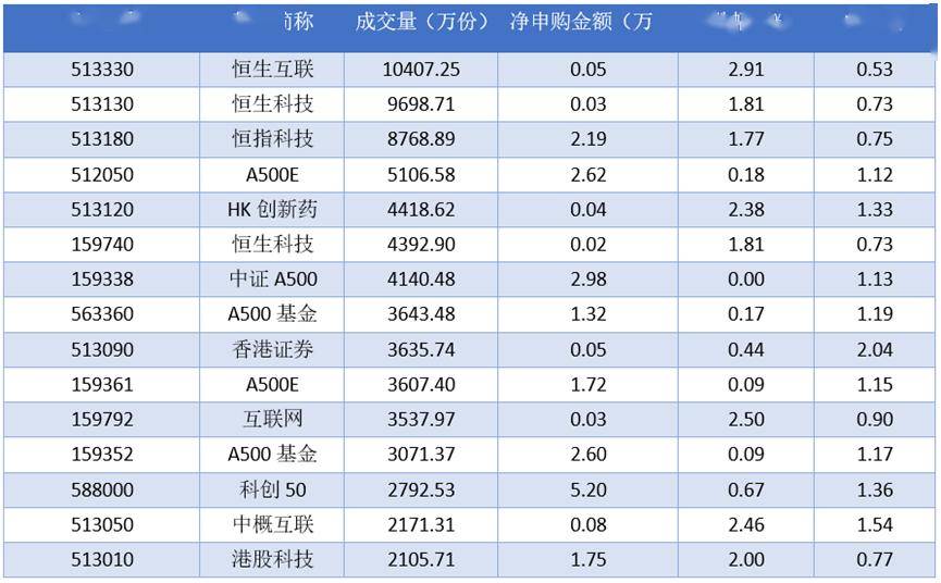 从成交量上来看,2025年11月24日成交量最大的是恒生互联(513330),成交量为10407.25万份。排名靠前的恒生科技 (513130)、恒指科技(513180)、A500E (512050),成交量分别为9698.71万份、8768.89万份、5106.58万份。 | | | 交量(万份) 净申购金额 | | 中 老 | | | --- | --- | --- | --- | --- | --- | | 513330 | 恒生互联 | 10407.25 | 0.05 | 2.91 | 0.53 | | 513130 | 恒生科技 | 9698.71 | 0.03 | 1.81 | 0.73 | | 513180 | 恒指科技 | 8768.89 | 2.19 | 1.77 | 0.75 | | 512050 | A500E | 5106.58 | 2.62 | 0.18 | 1.12 | | 513120 | HK 创新药 | 4418.62 | 0.04 | 2.38 | 1.33 | | 159740 | 恒生科技 | 4392.90 | 0.02 | 1.81 | 0.73 | | 15933 ...