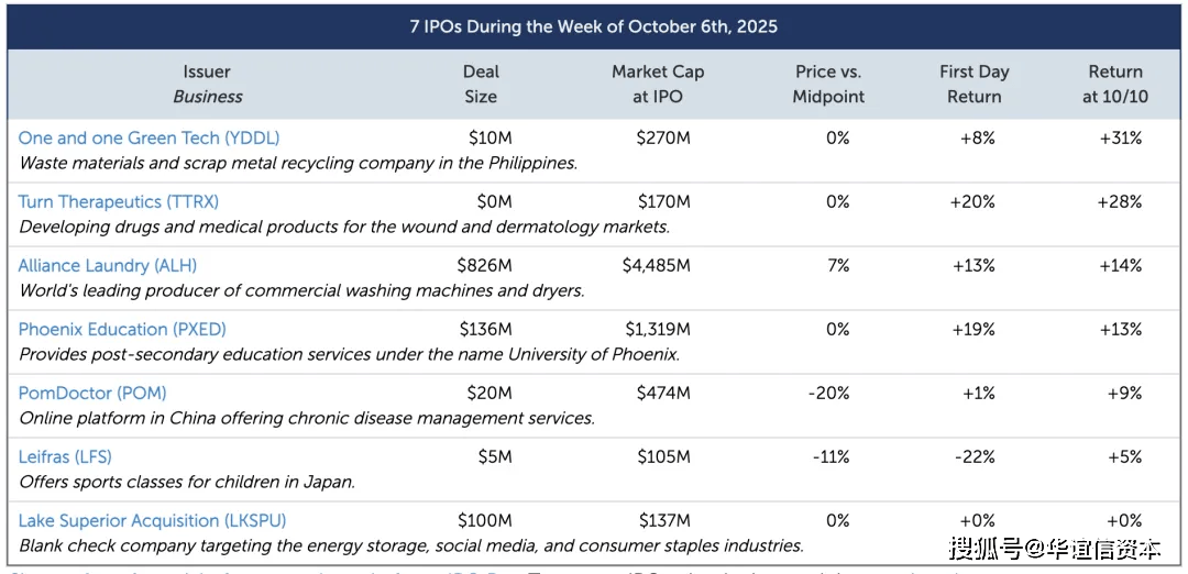 尽管美国政府关门,本周其IPO市场仍保持活跃:6家公司完成IPO、2家SPAC上市,另有13家IPO企业和5家SPAC企业提交初始申请。 | 7 IPOs During the Week of October 6th, 2025 | | | | | | | --- | --- | --- | --- | --- | --- | | Issuer | Deal | Market Cap | Price vs. | First Day | Return | | Business | Size | at IPO | Midpoint | Return | at 10/10 | | One and one Green Tech (YDDL) | $10M | $270M | 0% | +8% | +31% | | Waste materials and scrap metal recycling company in the Philippines. | | | | | | | Turn Therapeutics (TTRX) | SOM | $170M | 0% | +20% | +28% | | Developi ...