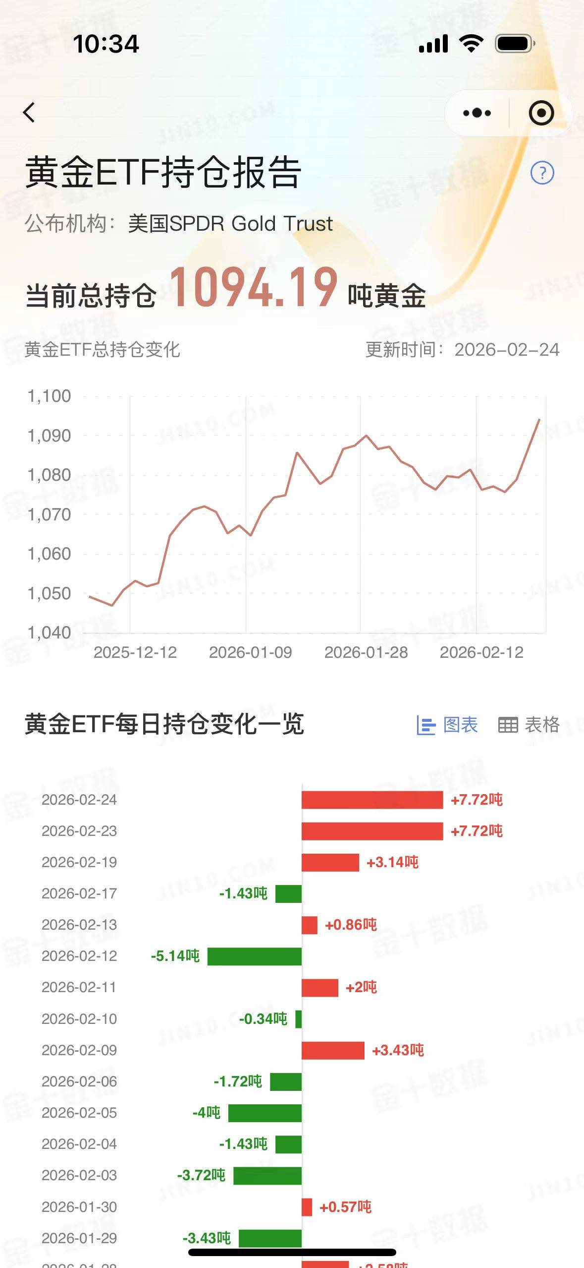 10:34 黄金ETF持仓报告 公布机构:美国SPDR Gold Trust 当前总持仓 1094.19 吨黄金 黄金ETF总持合变化 更新时间:2026-02-2 1,100 1.090 1,080 1,070 1,060 1,050 1,040 2025-12-12 2026-01-09 2026-01-28 2026-02-12 黄金ETF每日持仓变化一览 l= 图表 聞表 截至2月24日,全球最大的黄金ETF SPDR Gold Trust持仓量为1094.19吨,较前一个交易日再度大幅增加7.72吨。2月24日,现货黄金回调,盘中一度跌至 5100美元/盎司下方,收于5142.45美元/盎司,跌85.30美元/1.63%。在金价近日持续拉升之后,黄金ETF持仓量继续显著增加,从上周迄今累计增持幅度接近 20吨。 基本面消息,黄金周二从三周高位回撤,美元企稳叠加美联储官员鹰派言论共同压制金价。在金价持续冲高之后,获利了结情绪升温,也抑制了金价走势。 不过,值得注意的是,与此同时,地缘政治紧张局势与关税政策反复持续为金价提供支撑,多空博弈使行情陷入震荡。 美联储方面,芝加哥联储主席古尔斯比与亚特兰大联储 ...