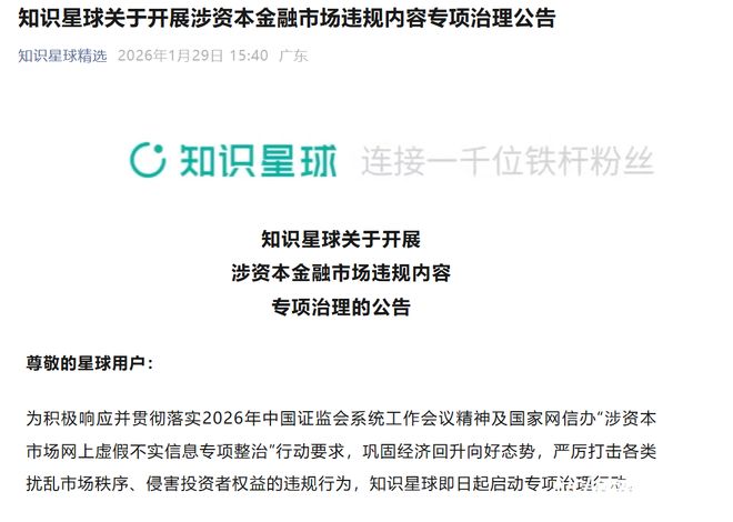 自步入1月下旬以来,资本市场乱象遭受严打。先是证监会出手,严惩"大V"金永荣操纵证券市场,后 有雪球跟进连发三份专项整治公告,封禁平台内诸多大V。 1月29日,知识星球同样发布了发布《关于开展涉资本金融市场违规内容专项治理的公告》。据悉,知 识星球将在五方面重点整治涉及资本市场的内容乱象。 知识星球重点整治5大内容 1月29日,知识星球发布《关于开展涉资本金融市场违规内容专项治理的公告》称,为积极响应并贯彻 落实2026年中国证监会系统工作会议精神及国家网信办"涉资本市场网上虚假不实信息专项整治"行动要 求,巩固经济回升向好态势,严厉打击各类扰乱市场秩序、侵害投资者权益的违规行为,知识星球即日 起启动专项治理行动。 或虚假理财。 从知识星球发布的公告来看,整治重点的方向包括五大类: 1、严厉打击恶意"唱衰"及歪曲国家经济政策行为。严禁恶意编造、传播"经济崩盘"、"政策失效"等恐 慌性言论;严禁对国家宏观经济政策进行断章取义、歪曲解读,或通过极端言论博取流量、诱导付费。 2、 深度清查"非法经济学家"及无资质违规课程。针对冒用"经济学家""首席分析师"等头衔开办星球、 售卖课程的行为进行资格复核。严禁无相关金融 ...
