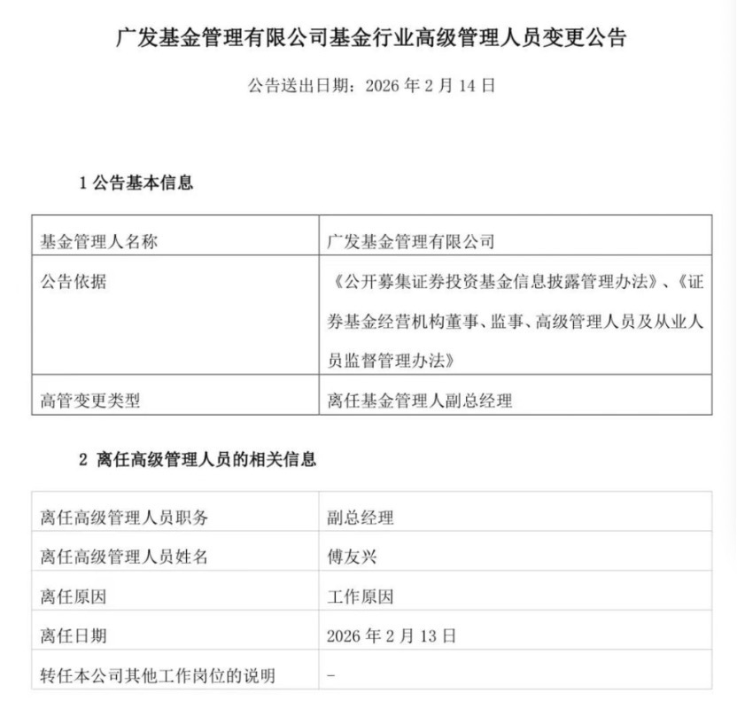 又一百亿基金经理卸任高管职务。 2月13日晚间,广发基金副总经理、联席投资总监傅友兴因工作原因将卸任公司副总职务。目前在管产品2只,管理规 模102.76亿元。 一个有意思的现象是,近年来,广发基金吸引了不少优秀基金经理的加入,冯汉杰之后,包括原中庚基金吴承根、原 建信基金周智硕、原嘉实基金苏文杰等追求绝对收益、周期投资的名将相继加入,补齐了广发基金主动权益的策略。 在业内看来,A股市场风格轮动加快,单一投资主线难以持续领跑,尤其是对于头部而言,仅靠赛道型基金难以为 继,公募基金高质量发展背景之下,基金管理人需具备多元策略储备与穿越周期的投研能力。 百亿明星基金经理卸任高管 广发基金公告称,公司副总经理傅友兴因工作原因卸任高管职务。 | 基金管理人名称 | 广发基金管理有限公司 | | --- | --- | | 公告依据 | 《公开募集证券投资基金信息披露管理办法》、《证 | | | 券基金经营机构董事、监事、高级管理人员及从业人 | | | 员监督管理办法》 | | 高管变更类型 | 离任基金管理人副总经理 | 公募业高管的职业选择越来越被行业关注,一方面是部分资深基金经理卸任高管职务,意在摆脱行政事务, ...