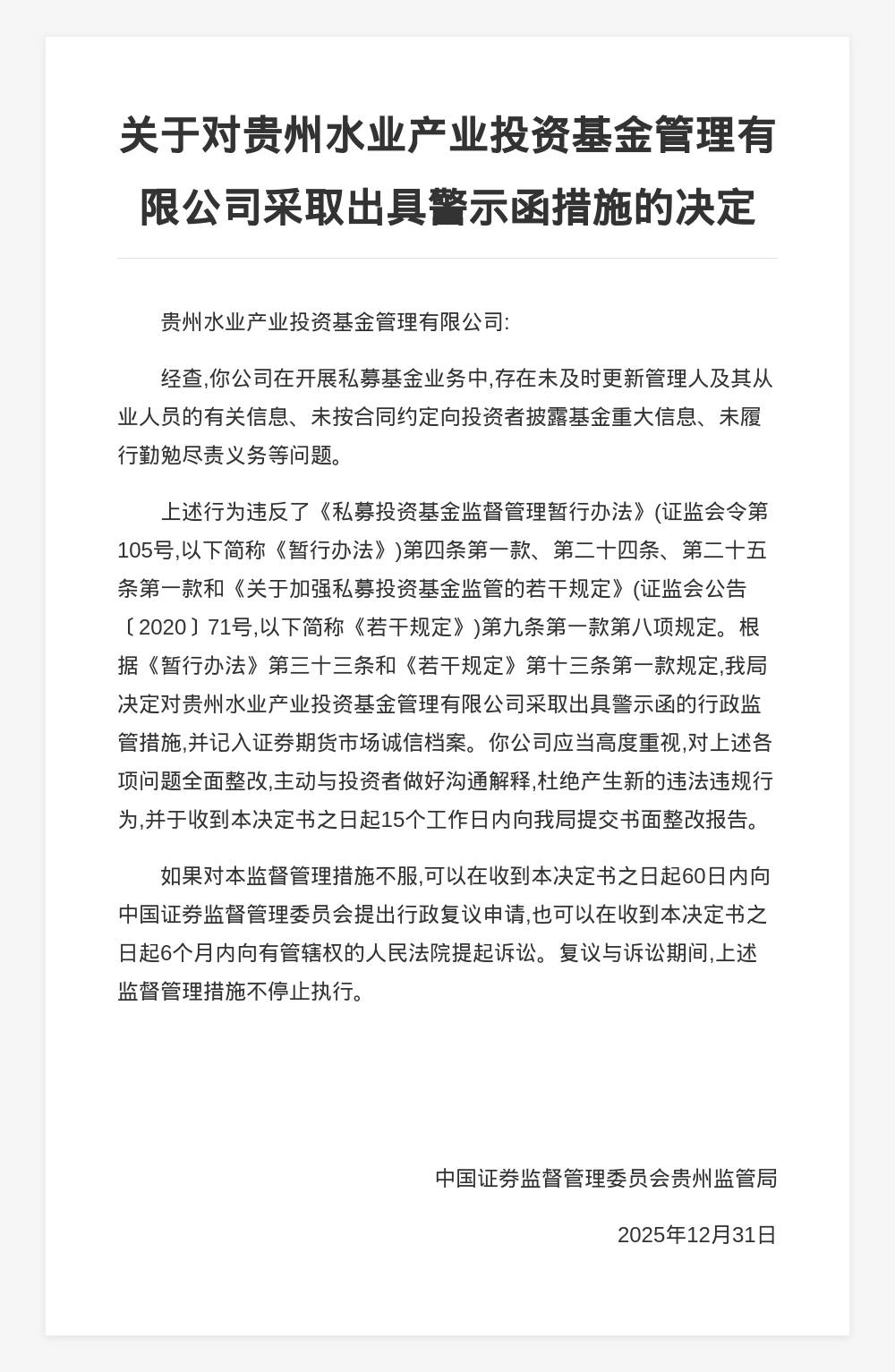 蓝鲸新闻2月16日讯,近日,中国证券监督管理委员会贵州监管局发布行政监管措施决定书,剑指贵州水业产业投资基金管理有限公司。 决定书显示,贵州水业产业投资基金管理有限公司在开展私募基金业务中,存在未及时更新管理人及其从业人员的有关信息、未按合同约定向 投资者披露基金重大信息、未履行勤勉尽责义务等问题。 上述行为违反了《私募投资基金监督管理暂行办法》《关于加强私募投资基金监管的若干规定》的规定。中国证券监督管理委员会贵州监管局 决定对贵州水业产业投资基金管理有限公司采取出具警示函的行政监管措施,并记入证券期货市场诚信档案。 中国证券监督管理委员会贵州监管局 2025年12月31日 ...