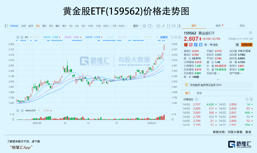 Core Viewpoint - The international gold market has experienced an unexpected strong rally since the beginning of 2026, with gold prices reaching historical highs due to various stimulating factors, including geopolitical tensions and monetary policy shifts [2][6]. Group 1: Gold Price Movements - International gold prices surged from $4,340 per ounce at the beginning of January to a peak of $4,891.1 per ounce by January 21, marking a cumulative increase of 12.7% in less than 20 days [2]. - Domestic gold futures also saw significant gains, with the main contract price rising by 4.61% to surpass 1,100 yuan per gram [3]. Group 2: Stock Market Reactions - Gold stocks experienced a surge, with over ten gold-related stocks hitting the daily limit up, including Zhaojin Mining and Chifeng Jilong Gold Mining [4]. - The gold ETF (159562) rose by 5.73% on the day, accumulating a 25.82% increase over the first 13 trading days of the year, reaching a new historical net value high [4]. Group 3: Geopolitical Factors - The recent escalation of geopolitical conflicts has driven significant inflows into gold as a safe-haven asset, with the U.S. imposing tariffs on several countries, further straining transatlantic trade relations [7][8]. - Denmark's decision to sell approximately $1 billion in U.S. Treasury bonds amid the Greenland dispute marked a significant move, reflecting growing concerns over U.S. debt and geopolitical tensions [9]. Group 4: Central Bank Actions - Global central banks have been on a gold-buying spree, with net purchases reaching 1,136 tons in 2024, the second-highest on record, and major buyers including China, Poland, and Turkey [11]. - China's central bank has increased its gold reserves significantly, with a total of 2,306.32 tons by the end of 2025, marking a historical high in the proportion of gold in its foreign exchange reserves [11]. Group 5: Market Sentiment and Predictions - Analysts have raised their gold price targets, with Goldman Sachs predicting a price of $4,900 per ounce by the end of 2026, driven by central bank purchases and anticipated interest rate cuts [21]. - Other institutions, such as UBS and Citigroup, have set even higher targets, with Citigroup suggesting a potential short-term price of $5,000 per ounce [21][22]. Group 6: Investment Trends - The demand for gold bars and coins increased by 18% in 2025, reaching 1,250 tons, with significant contributions from China [16]. - The global gold ETF market saw a record net inflow of $89 billion in 2025, with total holdings reaching 4,025 tons, marking a historical peak [16]. Group 7: Strategic Value of Gold - The strategic value of gold is being redefined, transitioning from an optional asset to a necessary component in high-uncertainty markets, as recognized by various market participants [22]. - The gold ETF (159562) has become a popular investment tool, with significant inflows and a focus on gold mining companies, reflecting the growing interest in gold as a strategic asset [23].