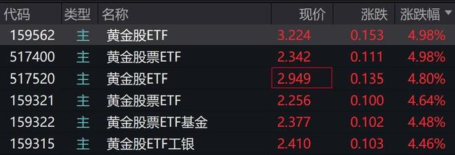 | 代码 | 类型 名称 | | 现价 | | 涨跌 涨跌幅 ▼ | | --- | --- | --- | --- | --- | --- | | 159562 | 主 | 黄金股ETF | 3.224 | 0.153 | 4.98% | | 517400 | H | 黄金股票ETF | 2.342 | 0.111 | 4.98% | | 517520 | H | 黄金股ETF | 2.949 | 0.135 | 4.80% | | 159321 | H | 黄金股票ETF | 2.256 | 0.100 | 4.64% | | 159322 | H | 黄金股票ETF基金 | 2.377 | 0.102 | 4.48% | | 159315 | | 主 黄金股ETF工银 | 2.410 | 0.103 | 4.46% | 现货黄金再创新高,首次突破5200美元/盎司,本月累计涨超880美元,逾20%。 黄金概念股早盘走强,湖南黄金涨停,中金黄金、赤峰黄金涨超6%。 受盘面影响,黄金股相关ETF涨超4%。 有分析人士指出,美国方面反复无常的政策信号,进一步削弱了投资者对美元资产的信心,推动金价进 一步走强。 ...