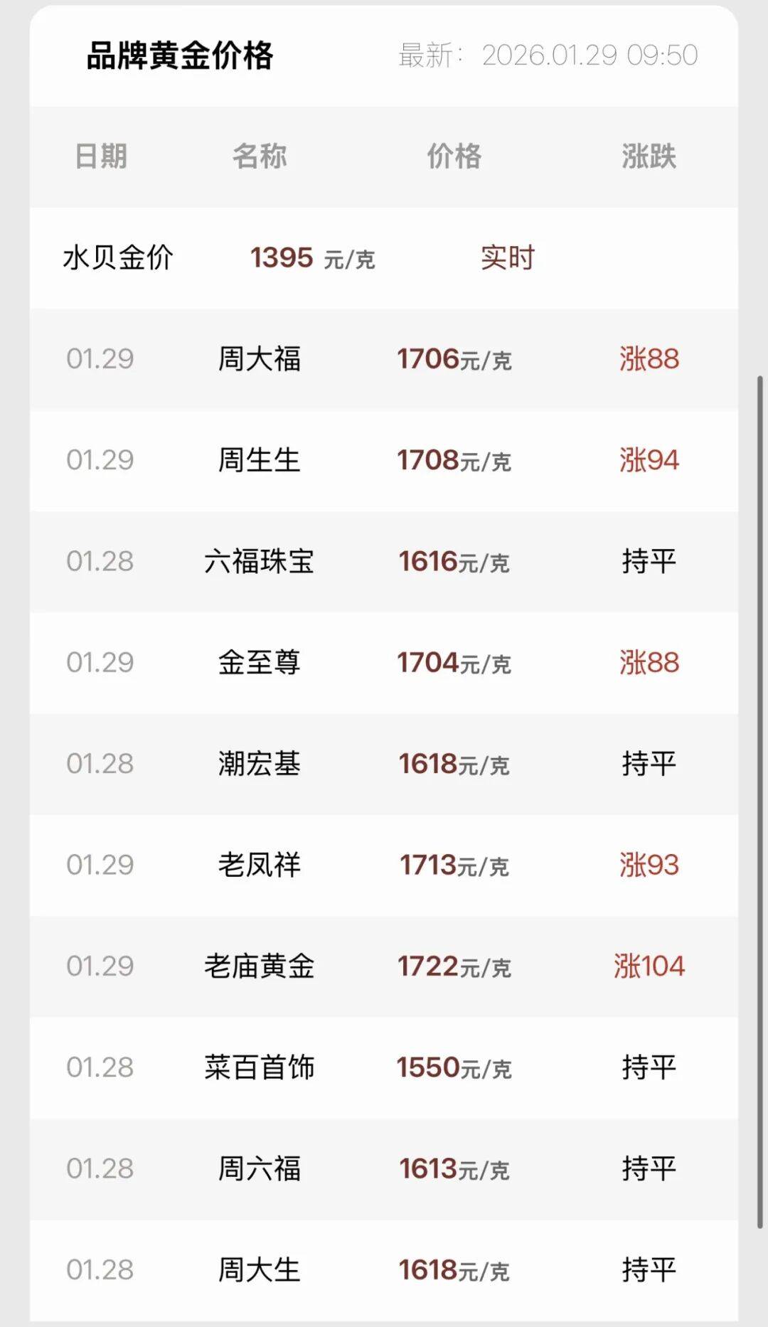 金价又涨了! 国内金饰价格每克已破1700元 最高一夜涨了104元/克 ↓ 老庙黄金报价1722元/克 上涨104元/克 周生生报价1708元/克 上涨94元/克 老凤祥报价1713元/克 上涨93元/克 周大福、金至尊报价1706元/克 | 品牌黄金价格 | | 最新: 2026.01.29 09:50 | | | --- | --- | --- | --- | | 日期 | 名称 | 价格 | 涨跌 | | 水贝金价 | 1395 元/克 | 实时 | | | 01.29 | 周大福 | 1706元/克 | 涨88 | | 01.29 | 周生生 | 1708元/克 | 涨94 | | 01.28 | 六福珠宝 | 1616元/克 | 持平 | | 01.29 | 等支障 | 1704元/克 | 涨88 | | 01.28 | 潮宏基 | 1618元/克 | 持平 | 上涨88元/克 | 01.29 | 老凤祥 | 1713元/克 | 涨93 | | --- | --- | --- | --- | | 01.29 | 老庙黄金 | 1722元/克 | 涨104 | | 01.28 | 菜百首饰 | 155 ...