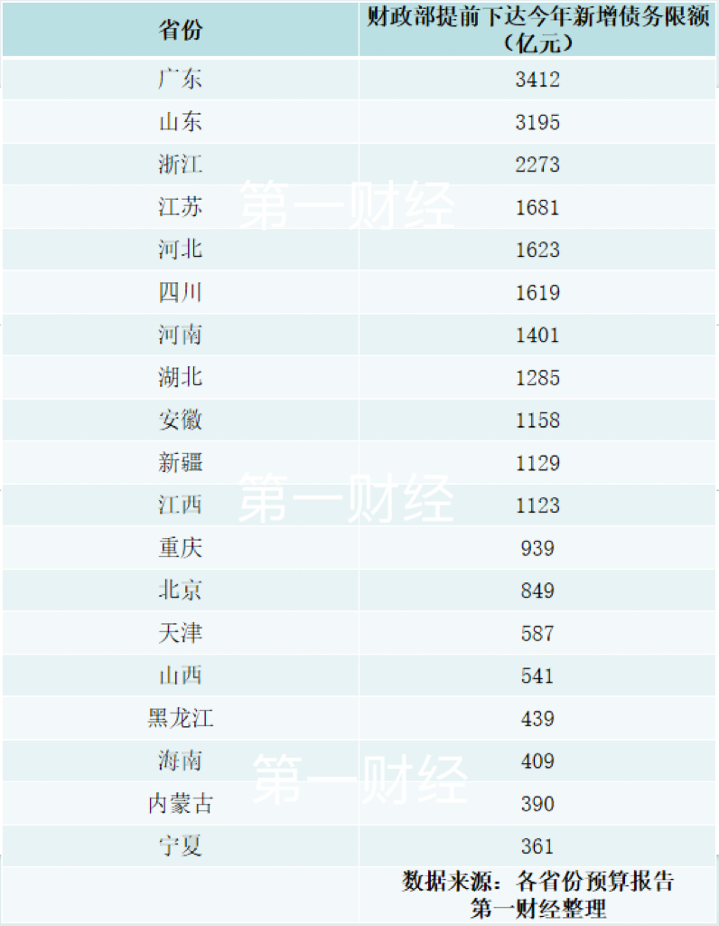 近期各省份陆续披露今年预算报告,其中部分省份公开了今年各自的提前批新增债务限额,这将有利于地方提前 发债筹集资金稳投资稳经济。 第一财经记者梳理各地预算报告发现,至少有19个省份披露了今年获得的提前批新增债务限额,合计规模约2.4万 亿元。其中广东省今年获得的新增债务限额最高,为3412亿元。山东获得的提前批新增债务限额紧随其后,约为 3195亿元。浙江这一额度超2000亿元,江苏、河北、四川等8省份超1000亿元,重庆、北京、天津等8省份这一额 度低于千亿(详见下表)。 | 省份 | 财政部提前下达今年新增债务限 (亿元) | | --- | --- | | 广东 | 3412 | | 山东 | 3195 | | 浙江 | 2273 | | 江苏 | 1681 | | 河北 | 1623 | | 四川 | 1619 | | 河南 | 1401 | | 湖北 | 1285 | | 安徽 | 1158 | | 新疆 | 1129 | | 江西 | 1123 | | 重庆 | 939 | | 北京 | 849 | | 天津 | 587 | | 山西 | 541 | | 黑龙江 | 439 | | 海南 | 409 ...