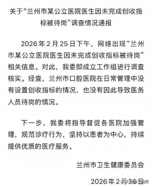 转自:扬子晚报 2月26日,甘肃省兰州市卫生健康委员会发布关于"兰州市某公立医院医生因未完成创收指标被待岗"调 查情况通报: 来 源:"兰 州卫健"微信公众号 2026年2月25日下午,网络出现"兰州市某公立医院医生因未完成创收指标被待岗"相关信息。对此,我 委即成立工作组进行调查核实。经查,兰州市口腔医院在日常管理中没有设置创收指标的情况,也没有 因此导致医务人员待岗的情况。 下一步,我委将指导督促各医院加强管理,规范诊疗行为,坚持以患者为中心,持续提供优质的医疗服 务。 ...