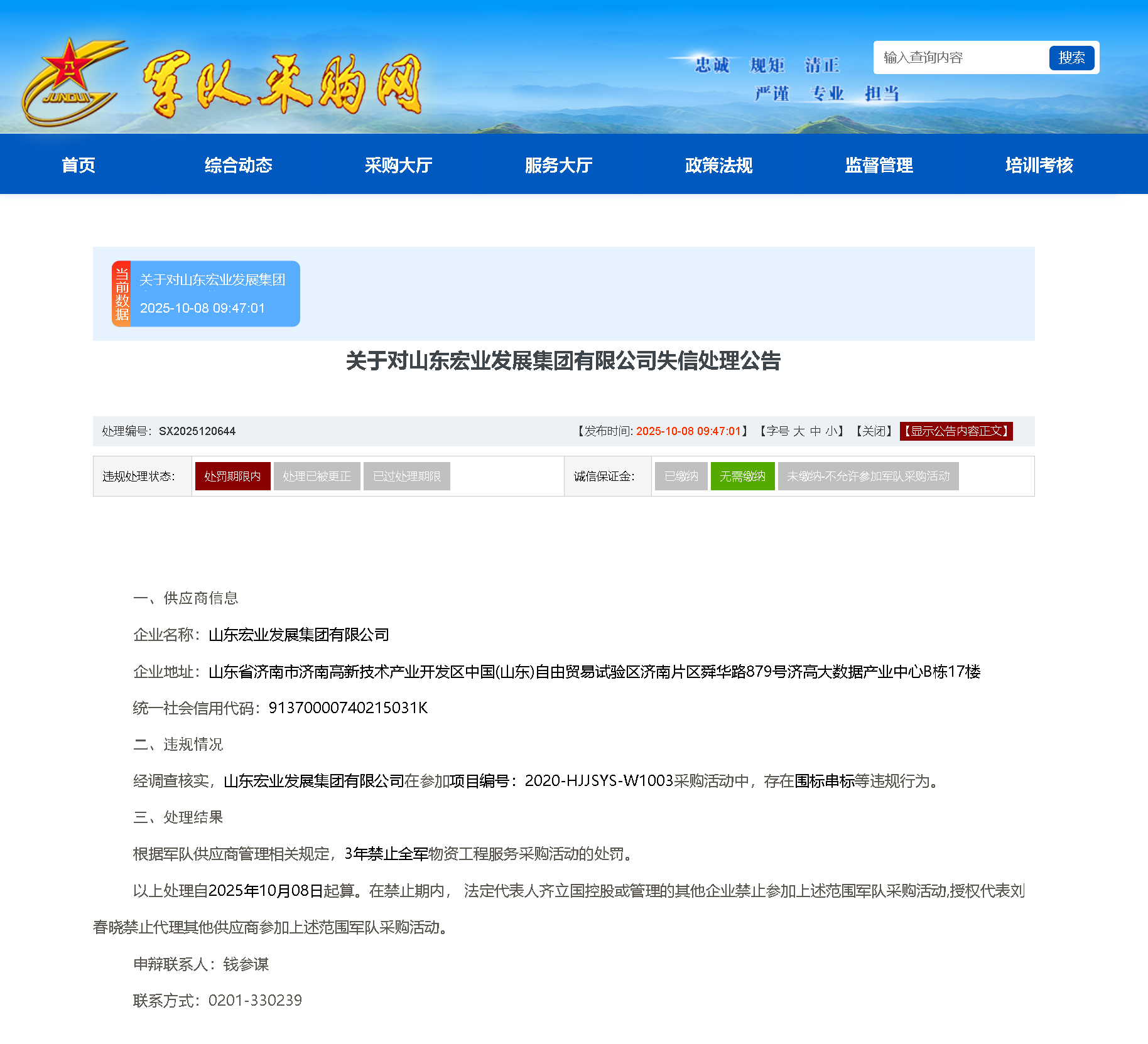 围标串标!山东宏业发展集团被全军采购禁入3年