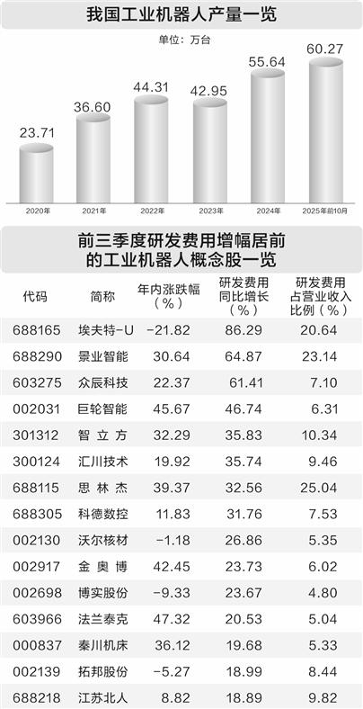 人民财讯11月26日电,近年来,全国工业机器人市场持续火热。根据国家统计局数据,今年1—10月我 国工业机器人产量达到60.27万台,同比增长28.8%,已超过2024年全年,产量创出新高。 据证券时报·数据宝统计,A股市场中布局工业机器人的概念股达到50只,主要从工业机器人整机及零件 生产、减速器、线缆等领域进行布局。从今年以来股价表现来看,概念股年内平均上涨32.41%,卧龙 电驱(600580)、中大力德(002896)、工业富联(601138)年初至今股价实现翻倍,万马股份 (002276)、新时达(002527)累计涨幅在80%以上。 我国工业机器人产量一览 单位:万台 60.27 55.64 44.31 42.95 36.60 23.71 20203 2021年 2024年 2025年前10月 20229 2023年 前三季度研发费用增幅居前 的工业机器人概念股一览 研发费用 研发费用 年内涨跌幅 同比增长 代码 简称 占营业收入 (%) (%) 比例(%) 86.29 20.64 688165 埃夫特-U -21.82 688290 景业智能 64.87 23.14 30.64 22.37 7. ...