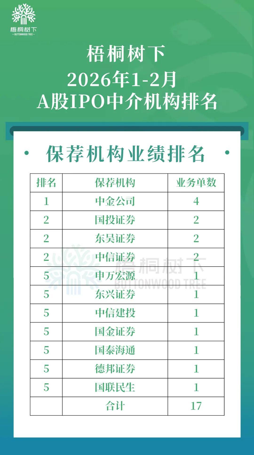 文/梧桐数据中心 2026年1-2月A股合计新上市公司17家,其中沪市主板4家、科创板4家、深市主板1家、北交所8家,相较去年同期的13家,同比上升31%。这17家新上市公 司募资净额为139.46亿元,相较去年同期的63.90亿元,同比上升118.25%。 一、保荐机构业绩排名 2026年1-2月,共有11家保荐机构承担了这17家新上市公司的IPO上市业务。 中金公司排名第一,业务单数为4单; 国投证券、东吴证券、中信证券3家券商各2单。 | 排名 | 保荐机构 | 业务单数 | | | --- | --- | --- | --- | | 中金公司 | 4 | 1 | | | 国投证券 | 2 | 2 | | | 东吴证券 | 2 | 2 | | | 中信证券 | 2 | 2 | 1 | | 5 | "申万宏源 | B. ROLL B | | | 5 | 东兴证券 | 1 | | | HILLEHI | 1 | L | | | D | 甲信足仅 | J | | --- | --- | --- | | 5 | 国金证券 | 1 | | 5 | 国泰海通 | 1 | | 5 | 德邦证券 | 1 | | 5 | ...