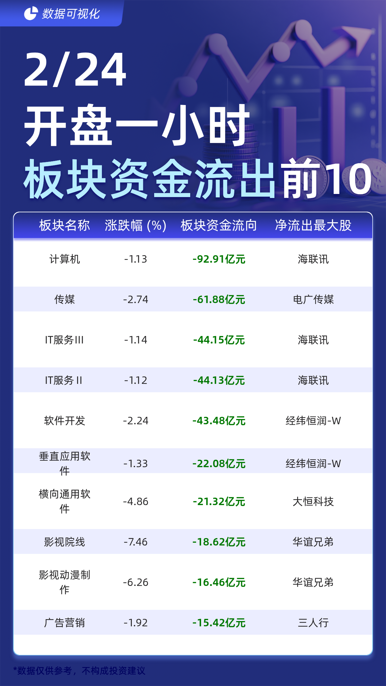 | 板块名称 | | 涨跌幅 (%) 板块资金流向 | 净流出最大 | | --- | --- | --- | --- | | 计算机 | -1.13 | -92.91亿元 | 海联讯 | | 传媒 | -2.74 | -61.88亿元 | 电广传媒 | | IT服务III | -1.14 | -44.15亿元 | 海联讯 | | IT服务 II | -1.12 | -44.13亿元 | 海联讯 | | 软件开发 | -2.24 | -43.48亿元 | 经纬恒润-W | | 垂直应用软 件 | -1.33 | -22.08亿元 | 经纬恒润-W | | 横向通用软 件 | -4.86 | -21.32亿元 | 大恒科技 | | --- | --- | --- | --- | | 影视院线 | -7.46 | -18.62亿元 | 华谊兄弟 | | 影视动漫制 作 | -6.26 | -16.46亿元 | 华谊兄弟 | | 广告营销 | -1.92 | -15.42亿元 | 三人行 | 据交易所数据显示,截至2月24日开盘一小时,大盘主力资金净流入69.90亿元。主力资金流出前十大板块分别为:计算机(-92. ...