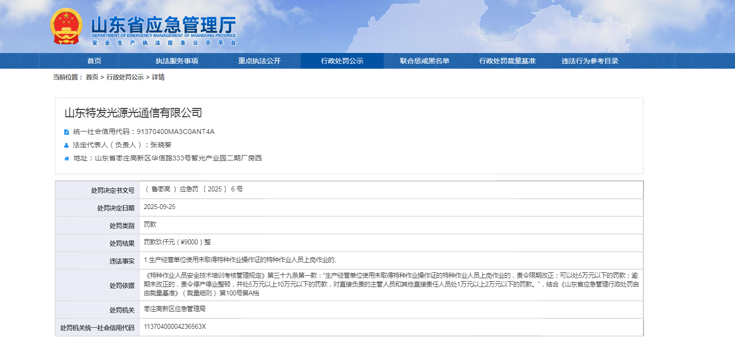 | 处罚决定书文号 | ( 鲁零高 ) 应急罚 〔 2025 〕 6 号 | | --- | --- | | 处罚决定日期 | 2025-09-25 | | 外留类别 | 罚款 | | 处罚结果 | 罚款玖仟元(¥9000)整 | | 声評 | 1.生产经营单位使用未取得特种作业操作证的特种作业人员上岗作业的 | | 外罚依据 | 《劳种作业人员安全技术培训考核管理规定》第三十九条第一款:"生产经营单位使用未取得劳神作业操作证的特种作业人员上岗作业的,责令限 期未改正的,麦令停产停业整顿,并处5万元以上10万元以下的罚款,对直接负责的主管人员和宾他直接责任人员处1万元以上2万元以下的罚款。 | | | 由裁量基准》(裁量细则)第100号第A档 | | 处罚机关 | 枣庄高新区应急管理局 | | 处罚机关统一社会信用代码 | 11370400004236563X | 处罚决定书内容显示,特发光源公司的违法事实为:生产经营单位使用未取得特种作业操作证的特种作业人员上岗作业的。对此,枣庄市高新区应急管理局 依据《特种作业人员安全技术培训考核管理规定》第三十九条第一款,结合《山东省应急管理行政处罚自由裁量基准》(裁量 ...