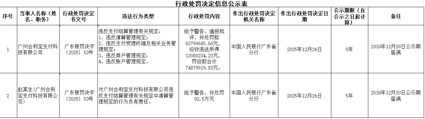 【文/羽扇观金工作室】 岁末年初,第三方支付行业再掀波澜。 2025年12月31日,中国人民银行广东省分行披露一则行政处罚信息,广州合利宝支付科技有限公司因四 项业务违规,被处以警告、通报批评,罚款6279.97万元,没收违法所得1208.02万元,罚没款项合计 7487.99万元。 与此同时,该公司相关负责人赵某生因对清算管理违规行为负有直接责任,被另行处以92.5万元罚款。 这一处罚金额刷新了2025年度支付行业罚单纪录,引发市场高度关注。 公开资料显示,合利宝支付于2013年在广州注册成立,注册资本1亿元,持有央行核发的《支付业务许 可证》,获准在全国范围内从事储值账户运营及支付交易处理业务,并具备跨境人民币支付资质。该公 司由A股上市企业*ST仁东间接持股95%,是后者主营业务的核心运营载体。 此次监管部门认定的违规事项涉及四个层面:清算管理不合规、支付受理终端及相关业务管理存在漏 洞、商户准入与管理失范、账户管理制度执行不到位。 上述问题几乎覆盖了收单支付业务的全流程关键节点,折射出企业内控机制的深层缺陷。面对监管重 罚,*ST仁东迅速发布公告回应,表示合利宝已足额缴纳罚款,当前经营秩序正常,并强调 ...