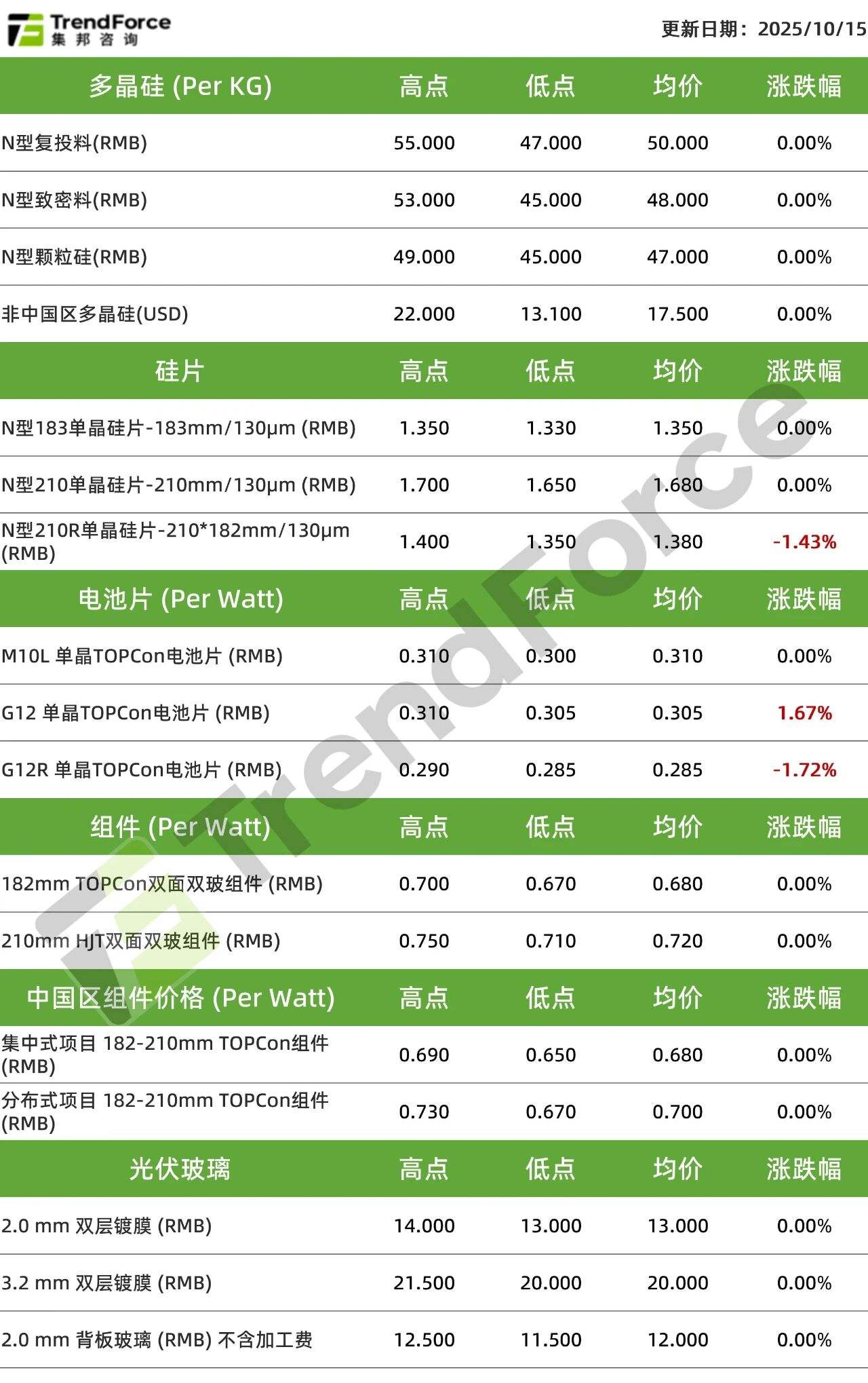 当前行业整体库存上升至41万吨以上,本月硅料库存继续保持小幅累库趋势。当前多晶硅市场成交整体清淡,签单量环比有所下降。 价格持稳主要受两方面因素影响:一方面,硅片企业开工率保持稳定,且仍持有相当数量的多晶硅库存,对硅料的定期采购需求总体平稳;另一方面,部分 硅料企业因检修或减产,可销售余量接近上限,故近期新签订单较少,仅少量保供订单成交,发货期已延至11月。 供需与库存 智通财经APP获悉,TrendForce发文称,光伏产业链在反内卷政策下,尽管短期供需关系不佳,但价格有望企稳。其中多晶硅环节、硅片环节及电池片环节 受到政策调控,预计本月价格将保持高位持稳。组件环节受终端需求疲软影响,整体价格上涨乏力。后续仍需重点关注反内卷政策推进落地效果,政策或继 续主导行业价格走势。 多晶硅环节 价格趋势 从供需基本面来看,硅片过剩格局依旧,且本月有继续提产,有加剧过剩趋势。下游抵触氛围也越发强烈,有减产倒逼价格迹象。 价格趋势 近期硅片价格也将承压,价格有下行风险。但日前自律会议再次传出产业链成本指导价格,企业也均有报涨心态。给原本预期要下行的硅片带来稳价甚至提 涨信心。 电池片环节 供需与库存 当前电池库存上升至7 ...