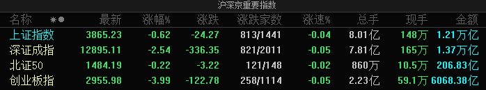 凤凰网财经讯 10月14日,市场全天震荡调整,创业板指、科创50指数盘中双双跌超4%。截至收盘,沪 指跌0.62%,深成指跌2.54%,创业板指跌3.99%。沪深两市成交额2.58万亿,较上一个交易日放量2215 亿。 | | | | 沪深京重要指数 | | | --- | --- | --- | --- | --- | | 名称 *● | 咸新 | 涨幅% | | 涨跌 涨跌家数 张速% 总手 现手 金额 | | 上证指数 | 3865.23 | -0.62 -24.27 | 813/1441 | -0.04 8.01 7 148万 1.21万亿 | | 深证成指 | 12895.11 | -2.54 -336.35 | 821/2011 | -0.05 7.81亿 165万 1.37万亿 | | 北证50 | 1484.19 | -0.22 -3.22 | 121/148 | 10.5万 206.83亿 -0.02 8607 | | 创业板指 | 2955.98 | -3.99 -122.78 | 258/1114 | -0.05 2.23亿 59.1万6068.38亿 | 盘面上,市场热点较为杂乱,超硬 ...