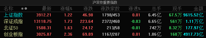 凤凰网财经讯 10月15日,市场探底回升,沪指涨超1%重回3900点,创业板指探底回升涨超2%。截至收 盘,沪指涨1.22%,深成指涨1.73%,创业板指涨2.36%。沪深两市成交额2.07万亿,较上一个交易日缩 量5034亿。 | | | | | 沪深京重要指数 | | | | | --- | --- | --- | --- | --- | --- | --- | --- | | 名称 *● | 咸新 | 张幅% | | 涨跌 | | 息手 | 现手 金额 | | 上证指数 | 3912.21 | 1.22 | 46.98 | 1798/453 | 0.01 | 6.45 7. | 67.5万 9615.52亿 | | 深证成指 | 13118.75 | 1.73 | 223.64 | 2372/460 | -0.03 | 6.65 亿 | 561万 1.11万亿 | | 北证50 | 1508.31 | 1.63 | 24.12 | 213/58 | -0.01 | 742万 | 8.32万 177.97亿 | | 创业板指 | 3025.87 | 2.36 | 69.89 | 1167/207 | 0. ...