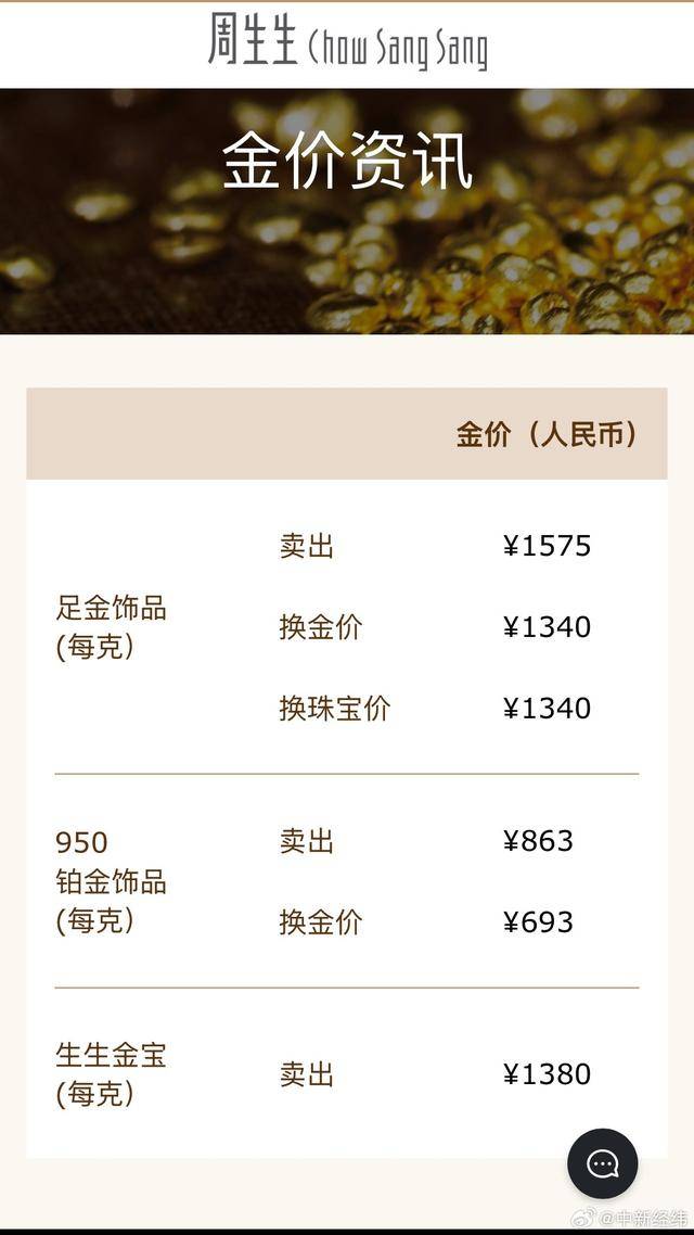 | | 卖品 | ¥1575 | | --- | --- | --- | | 足金饰品 (每克) | 换金价 | ¥1340 | | | 换珠宝价 | ¥1340 | | 950 | ## | *863 | | 铂金饰品 | | | | (每克) | 换金价 | *693 | 生生金宝 ¥1380 型出 (每克) 国 68 @中新经纬 2月23日,黄金、白银开盘直线拉涨。截至发稿,国际现货黄金涨幅为0.73%,报5149美元/盎司;现货 白银突破86美元/盎司,日内涨超2%。 国内品牌金饰延续上涨趋势,周生生足金饰品报1575元/克,较21日1550元/克涨20元。 ...