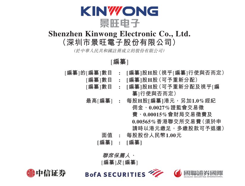 智通财经APP获悉,据港交所1月1日披露,深圳市景旺电子股份有限公司(简称:景旺电子)向港交所主板递交上市申 请,中信证券、美银证券、国联证券国际为其联席保荐人。招股书显示,景旺电子(603228.SH)是以技术创新为驱 动、以产品布局全面为特色的全球领先PCB产品制造商。公司的PCB产品为汽车电子、通信与数据基础设施、智能终 端、工业控制等领域的全球客户提供智能互联基础。 KIN"/ONG 景旺电子 [編纂] 聯席保薦人 · [編纂]及[編纂] Shenzhen Kinwong Electronic Co., Ltd. (深圳市景旺電子股份有限公司) (於中華人民共和國註冊成立的股份有限公司) 4 中信证券 ( ) 國際設計國際 BofA SECURITIES " :[編纂]股H股(視乎[編纂]行使與否而定) [編纂]的[編纂]數目 [編纂]數目 「編纂]股H股(可予重新分配) : [編纂]數目 [編纂]股H股(可予重新分配及視乎[編 : 纂]行使與否而定) 最高[編纂] 每股H股[編纂]港元,另加1.0%經紀 : 冊金、0.0027%證監會交易徵 費 · 0.00015%會財局交易徵費及 0.00565% ...