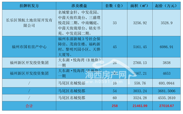 海西房产网(微信公众号:fjhxfcw)消息:近期,福州国企平台正在加速抛售房产。 数据统计显示,9月22日以来,包括长乐区领航土地房屋开发有限公司、福州市国有房产中心、福州新 区开发投资集团等平台陆续发布七则转让公告。 | 挂牌转发方 | 涉及楼盘 | 套数(套) | 面积(m') | 起价(万元) | | --- | --- | --- | --- | --- | | 长乐区领航土地房屋开发有 | 名城紫金轩、中发花园、 | | | | | | 中菌天俊玖珑台、三盛瑾 | | | | | 限公司 | 悦花园二期、中南樾庭、 | 33 | 3256. 92 | 3528.9 | | | 中菌天俊珑璟台、铭实书 | | | | | | 苑、中发花园二期。 | | | | | 福州市国有房产中心 | 福州东部新城3号社会保 障房、茂商住楼、福屿新 | 45 | 5161. 45 | 6086. 91 | | | 村、黎明兴园小区、天骅 | | | | | | 大厦等。 | | | | | 福州新区开发投资集团 | 大东湖 · 悦海湾(B 地块) | 26 | 2760. 13 | 3838 | | | 一期 | ...