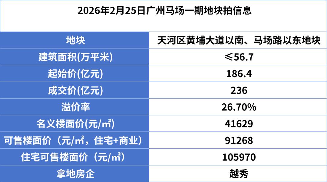 节后楼市最强烈的两大关键信号,在2月25日同一天释放。 上海落地"沪七条",非沪籍购房门槛"史诗级"松绑,向市场释放"稳定楼市"的积极信号。 广州节后土拍首秀,8家房企上演了一场历时9小时、243轮的土地争夺战,最终马场一期地块溢价率达到26.6%,以236亿元的成交总价位列广州历史第 二、全国第五。可售楼面价91268元/㎡(住宅+商业)更是一举刷新了广州单价地王纪录。 01 对于广州而言,这场地王成交更是一剂"强心针",地市开门红也将带动新房、二手房市场信心回升,为3月"小阳春"筑牢基础。 02 在行业底部确认的关键阶段,广州拍出的全国性地王级地块说明了什么? 广州马场一期地块未拍先火,起拍价就达到了186.4亿元。 在2月10日举办的2026年广州市首场土地推介沙龙中,重点推介了马场、中山八、嘉禾望岗、东乡等多宗优质地块,马场则是其中重点推介地块,吸引了 约十家开发商高度关注。 | 2026年2月25日广州马场一期地块拍信息 | | | --- | --- | | 地块 | 天河区黄埔大道以南、马场路以东地块 | | 建筑面积(万平米) | ≤56.7 | | 起始价(亿元) | 186.4 | | 成 ...