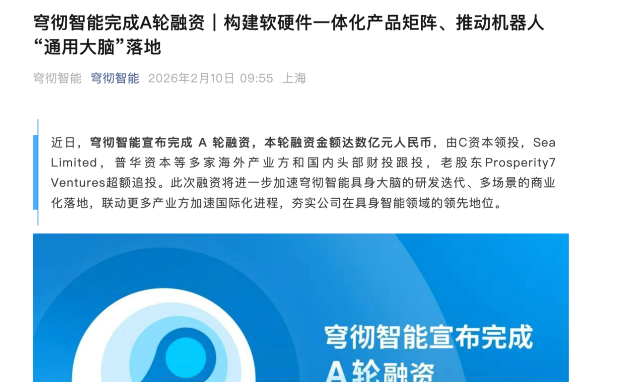 穹彻智能成立于2023年11月,致力于打造以"力为中心"的具身智能大模型及相关基础设施,构建从数据采集、模型训练到场景部署的完整技术闭环。公司成 立两年多以来,在具身智能数据定义与工具链开发方面取得显著进展,提出"伴随式数据采集"理念,并自主研发了外骨骼CoMiner、便携采集设备 RoboPocket等硬件,形成了覆盖数据采集、管理、硬件支撑的全链路工具平台。 【环球网科技报道 记者 李文瑶】2月10日消息,近日,专注于具身智能技术研发的前沿科技公司——穹彻智能宣布完成A轮融资,融资金额达数亿元人民 币。本轮融资由C资本领投,Sea Limited、普华资本等多家海内外产业投资方及财务投资机构跟投,老股东Prosperity7 Ventures亦超额追加投资。 在商业化方面,穹彻智能已推出搭载自研"大脑"的软硬件一体解决方案,并与多家行业龙头企业合作,在酒店服务、零售药房等场景推动机器人批量部署。 其中,在智能药房场景中,机器人已可实现从接单、取货到打包的全流程自动化作业,验证了技术在真实环境中的可靠性与实用性。公司还在物流分拣、家 庭整理、酒店洗衣等多元化场景持续拓展,展现了其技术的高度泛化能力和快速部署 ...
