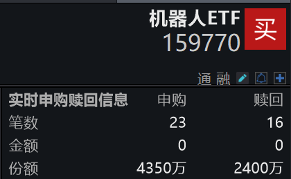 截至2026年2月10日 14:09,机器人ETF(159770)F盘中换手2.23%,成交2.26亿元。跟踪的中证机器人指数(H30590)强势上涨1.09%,成分股克来机电上涨 9.99%,云天励飞上涨6.20%,科瑞技术上涨5.66%,埃夫特,雷赛智能等个股跟涨。 值得一提的是,机器人ETF(159770)盘中已获资金净申购1950万份。 | | 机器人ETF 159770 | ਨੇ | | --- | --- | --- | | | | 中心 > 品 果 | | 实时申购赎回信息 | 申购 | 顺 | | 笔数 | 23 | 16 | | 金额 | 0 | 0 | | 份额 | 4350万 | 2400万 | 截至2月9日,机器人ETF(159770)近1周规模增长1.52亿元,近1周份额增长1.53亿份,实现显著增长。 【相关产品】 机器人ETF(159770),对应场外联接基金(A:014880;C:014881)。 【热点事件】 北京人形机器人创新中心发布具身天工3.0 今日(2月10日),北京人形机器人创新中心正式发布新一代通用机器人平台具身天工3.0,该款机器人以"更开放、更好用"为核心目标 ...