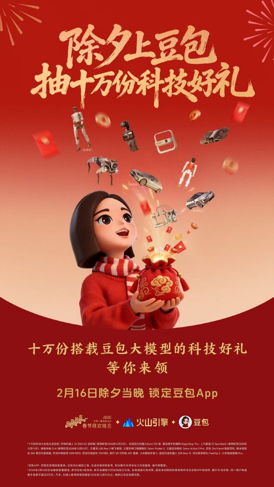 新浪科技讯 2月10日上午消息,豆包宣布"豆包过年"新春活动正式开启,活动期间将为用户发放新春红 包。此外,除夕夜的中央广播电视总台2026年春晚期间,豆包还将为全国观众送出超过10万份接入豆包 大模型的科技好礼,以及现金红包。 据了解,此次豆包送出的"科技礼包"囊括17款热门产品,包括宇树机器人、拓竹3D打印机、大疆无人 机等前沿科技产品,也有极米投影仪、苏泊尔电饭煲等智能消费品,同时,科技好礼中还涵盖上汽奥迪 E5 Sportback和奔驰CLA两款电车使用权。 值得一提的是,此次抽取的科技奖品均通过火山引擎深度融合了豆包大模型能力。以总台春晚即将送出 的宇树机器人为例,其拟人的音色与语气由豆包大模型的语音合成模型、大语言模型(LLM)以及视 觉语言模型(VLM)技术提供支持。奖品中的上汽奥迪E5 Sportback基于豆包大模型打造"奥迪助手", 让用户和汽车可以实现近乎真人的自然对话体验。 责任编辑:杨赐 新浪科技讯 2月10日上午消息,豆包宣布"豆包过年"新春活动正式开启,活动期间将为用户发放新春红 包。此外,除夕夜的中央广播电视总台2026年春晚期间,豆包还将为全国观众送出超过10万份接入豆包 大 ...
