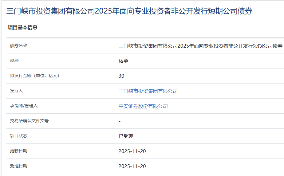 【大河财立方消息】11月20日,三门峡市投资集团有限公司2025年面向专业投资者非公开发行短期公司债券项目获上交所受理。 | 债券名称 | 三门峡市投资集团有限公司2025年面向专业投资者非公开发行短期公司债券 | | --- | --- | | 品种 | 私募 | | 拟发行金额(单位:亿元) | 30 | | 发行人 | 三门峡市投资集团有限公司 | | 承销商/管理人 | 平安证券股份有限公司 | | 交易所确认文件文号 | | | 项目状态 | 已受理 | | 更新日期 | 2025-11-20 | | 受理日期 | 2025-11-20 | 责编:王时丹 | 审核:李震 | 监审:古筝 本期债券拟发行规模30亿元,承销商/管理人为平安证券。2025年6月26日,经中诚信国际综合评定,发行人主体信用评级为AA+, 展望稳定。 ...