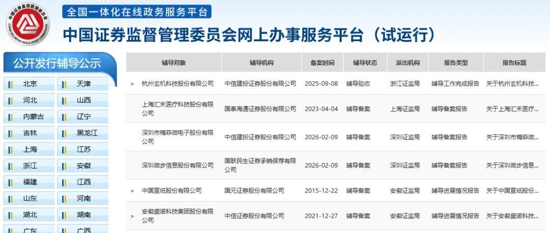 公开信息显示,永志股份成立于2007年10月15日,注册资本11333.1472万元,法定代表人为熊志,注册地址位于江苏省泰州市泰兴市三联村,所属行业为 计算机、通信和其他电子设备制造业。 近日,江苏永志半导体材料股份有限公司(以下简称"永志股份")正式启动首次公开发行股票并上市辅导备案工作。 | | | 公开发行辅导公示 | | 辅导对象 | 辅导机构 | 备客时间 辅导状态 | 派出机构 | 报告 201 | 报告标题 | | --- | --- | --- | --- | --- | --- | --- | --- | --- | --- | | - | 北京 | | 天津 | > 杭州玄机科技股份有限公司 | 中信建投证券股份有限公司 | 2025-09-08 第三院校 | 浙江证监局 | 辅导工作完成报告 | 关于杭州玄机科技 ... | | - | 河北 | | mose | 上海汇禾医疗科技股份有限 | | | | | | | - | 内蒙古 | -11- | 辽宁 | 公司 | 国泰海通证券股份有限公司 | 2023-04-04 辅导备案 | 上海证监局 | 辅导备案报告 | 关于上海汇天医疗 ...