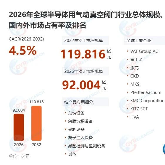 半导体用气动真空阀门是专为半导体制造工艺中各类真空系统设计的自动化执行元件,其核心功能是精确控制 特定真空管路中气体的 " 通 " 与 " 断 " ,从而隔离或连接不同的工艺腔室,确保芯片制造能够在要求的高真空 甚至超高真空环境下稳定进行。 根据 QYResearch 最新调研报告显示,预计 2 03 2 年全球 半导体用气动真空阀门 市场规模将达到 17.62 亿美 元,未来几年年复合增长率 CAGR 为 4.5% 。 半导体用气动真空阀门 的主要生产商 | 总部 / 国家 | 公司名称 | 业务介绍 | | --- | --- | --- | | | VAT Group AG | VAT Group AG 是一家全球领先高性能真空阀及真空解决方案开发与制造商 。 | | | | VAT 的主要业务包括设计、制造和供应高端真空阀、气体入口阀、多阀模块、 | | 瑞士 | | 边缘焊接金属波纹管及相关增值服务,其产品广泛用于半导体、显示器、光 | | | | 伏、真空镀膜等制造业以及科研领域,在半导体真空阀市场拥有显著的全球份 | | | | 额。公司还提供全球服务如备件、维修与升级服务。 | | | 富士金 ...