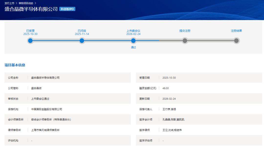 盛合晶微是一家集成电路晶圆级先进封测企业。本次IPO,该公司计划募集资金48亿元。其中,40亿元用于三维多芯片集成封装项目、8亿元用于超高密 度互联三维多芯片集成封装项目的建设。 2.5D集成大陆市占率第一 持续布局3D集成等领域 上交所上市审核委员会今日(2月24日)审议通过了盛合晶微科创板IPO申请。该公司上市申请于2025年10月30日获受理,经历两轮问询后,成为2026春 节后第一家过会企业。 此外,盛合晶微在招股书中披露了业绩预测,该公司预计2026年1-3月实现营业收入16.6亿元-18亿元,同比增加9.91%-19.91%,归母净利润为1.35亿元-1.5 亿元,同比增加6.93%-18.81%。 2.5D/3D封装高增长态势延续,国内外龙头密集扩产布局 从行业方面来看,近年来,智能手机等移动终端向小型化、集成化、高性能方向更新迭代,带动单机芯片数量和芯片性能要求的提升,是全球先进封装行 业发展的最重要驱动因素之一。与此同时,人工智能、数据中心等高性能运算产业正逐步成为先进封装行业的关键增长点和盈利点。 其中,芯粒多芯片集成封装是先进封装行业主要增长点转变的最充分受益者。Yole数据显示,全球芯 ...