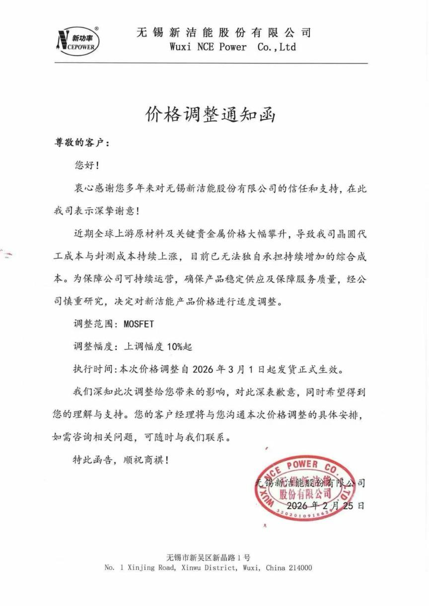 近日,国内功率半导体设计龙头新洁能(605111.SH)发布涨价函,宣布公司对MOSFET产品进行价格 上调,上调幅度10%起,此次价格调整自2026年3月1日起发货正式生效。 新洁能在涨价函中表示,提价的核心原因是近期全球上游原材料及关键贵金属价格大幅攀升,导致公司 晶圆代工成本与封测成本持续上涨,目前已无法独自承担持续增加的综合成本,为保障公司可持续运 营、确保产品稳定供应及服务质量,经慎重研究后决定适度调价。 无 锡 新 洁 能 股 份 有 限 公 司 Wuxi NCE Power Co., Ltd 价格调整通知函 尊敬的客户: 调整幅度:上调幅度 10%起 执行时间:本次价格调整自 2026年3月1日起发货正式生效。 我们深知此次调整给您带来的影响,对此深表歉意,同时希望得到 您的理解与支持。您的客户经理将与您沟通本次价格调整的具体安排, 如需咨询相关问题,可随时与我们联系。 特此函告,顺祝商棋! 无锡市新吴区新晶路1号 No. 1 Xinjing Road, Xinwu District, Wuxi, China 214000 新洁能涨价函 您好! 衷心感谢您多年来对无锡新洁能股份有限公司的信任和支 ...