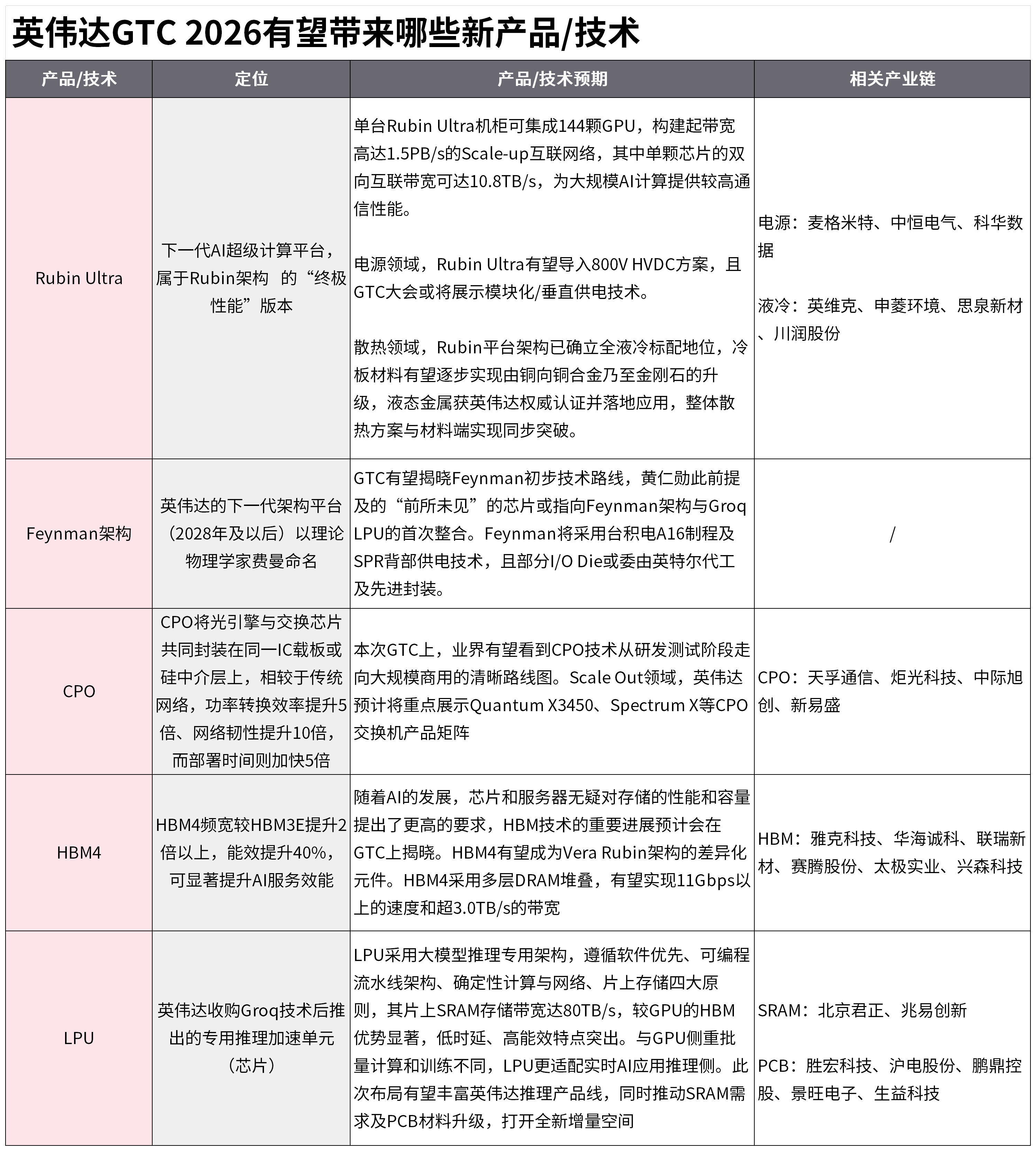 英伟达GTC 2026有望带来 *免责声明:文章内容仅供参考,不构成投资建议 *风险提示:股市有风险,入市需谨慎 | | 物理学家费曼命名 | SPF | | --- | --- | --- | | | | 及争 | | CPO | CPO将光引擎与交换芯片 | | | | 共同封装在同一IC载板或 | 本次 | | | 硅中介层上,相较于传统 | 向ブ | | | 网络,功率转换效率提升5 预计 | | | | 倍、网络韧性提升10倍, | 交并 | | | 而部署时间则加快5倍 | | | HBM4 | | 随着 | | | HBM4频宽较HBM3E提升2 提出 | | | | 倍以上,能效提升40%, | GT( | | | 可显著提升AI服务效能 | 元华 | | | | 下良 | | | | LPL | | | | 流才 | | | 英伟达收购Groq技术后推 | 则, | | LPU | 出的专用推理加速单元 | 优萝 | | | (芯片) | 量六 | | | | 次有 | | 产品/技术 | 定位 | | | --- | --- | --- | | Rubin Ultra | 下一代AI超级计 ...