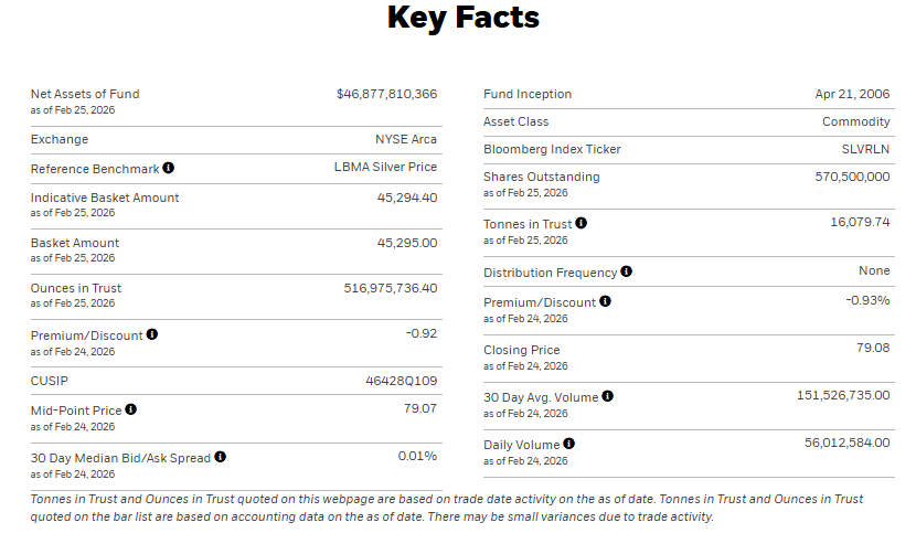 | Net Assets of Fund | $46,877,810,366 | Fund Inception | Apr 21, 2006 | | --- | --- | --- | --- | | as of Feb 25, 2026 | | | | | | | Asset Class | Commodity | | Exchange | NYSE Arca | | | | | | Bloomberg Index Ticker | SLVRLN | | Reference Benchmark O | LBMA Silver Price | | | | | | Shares Outstanding | 570,500,000 | | Indicative Basket Amount | 45,294.40 | as of Feb 25, 2026 | | | as of Feb 25, 2026 | | Tonnes in Trust | 16,079.74 | | Basket Amount | 45,295.00 | as of Feb 25, 2026 | | | as of Feb 25, 2026 ...