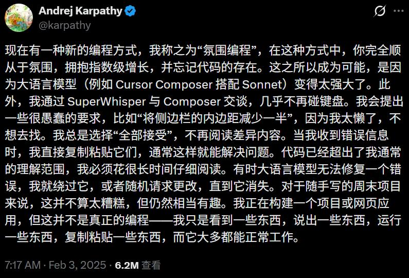 从随手发推的「氛围组」到掌控全局的「工程师」,Karpathy 用一年时间告诉我们:AI编程不再是玩具,不懂架构的人终将沦为看客,而能驾驭智能体 的人正在重塑规则。 再见,Vibe Coding! 你好,Agentic Engineering! 距离那个「靠直觉写代码」的狂欢时代才过去一年,Andrej Karpathy就亲自按下了升级键。 这一次,不再是「氛围」,而是残酷而精密的「工程」。 就在昨天,Andrej Karpathy交出了新的思考答卷—— 「智能体工程」(Agentic Engineering)。 一个意外的「爆款」 回看那一刻,Karpathy坦言自己也觉得不可思议: 我的Twitter账号已经用了17年了,但说实话,我基本上还是完全摸不透推文互动的规律。 而一年后的今天,利用LLM Agent编程已成为专业人士的「默认设置」。只不过,监督和审查要更多了些。 为了将这种更严谨、更注重质量的模式与之前的「氛围流」区分开,Karpathy又提出了一个新的概念——「智能体工程」(Agentic Engineering)。 所谓「智能体」,是因为你99%的时间不再直接写代码,而是在指挥智能体干活,充 ...