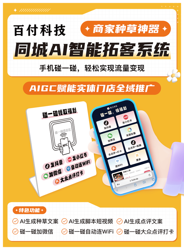 咱开实体店的老铁,这几年是不是感觉被流量PUA了?花钱投流吧,肉疼;自己拍视频吧,头疼。顾客 进店拍个照都嫌麻烦,更别说指望他们帮你发抖音宣传了。 直到这两年,"碰一碰拓客系统"火起来了。顾客手机贴一下你的小卡片,AI自动给他生成探店视频,他 点一下就直接发到自己抖音上,还自动带你家定位和团购链接。 这玩意儿听起来玄乎,但2026年了,技术到底成不成熟?哪家是真能打,哪家是吹牛皮? 第一名:百付科技碰碰鸭——6万+老板用脚投出来的"闭眼入款" 一句话用户评价:"招个剪辑师月薪八千,还天天请假。这玩意儿碰一下,视频自己出来,链接自己挂 上,关键是顾客愿意发。" 凭啥它第一? 老板最买账的三个点: 1. 真·全自动,懒人福音:商家上传一次基础素材(菜单、环境图啥的),AI直接吃透,后面顾客来 店一碰,8秒钟生成一条探店视频,带你家定位、带团购链接,全程不用老板动一根手指。 2. 顾客愿意发,没心理负担:流程极简——碰一下,点一下"授权发布",完事。不像以前求爷爷告 奶奶让顾客扫码、注册、传照片,顾客嫌烦,店员尴尬。这玩意儿把"帮老板发广告"变成了"分享 我的精彩生活",心理门槛直接干没了。 3. 效果肉眼可见,不 ...