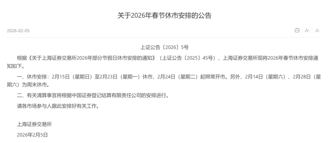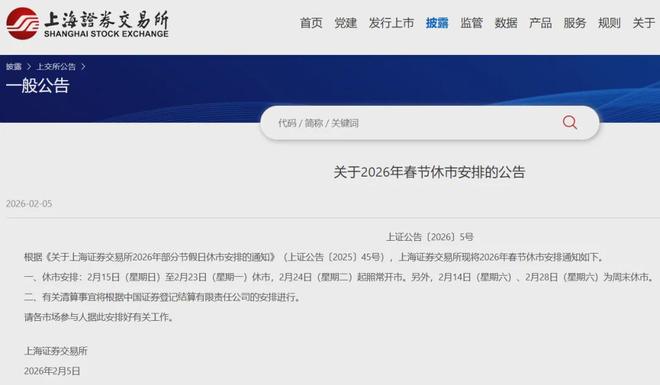 转自:成都发布 近日 上海证券交易所 深圳证券交易所 一起来看 上海证券交易所 春节休市安排 上海证券交易所2026年春节休市安排通知如下: 2月15日(星期日)至2月23日(星期一)休市,2月24日(星期二)起照常开市。另外,2月14日(星期六)、2月28日(星期六)为周末休市。 北京证券交易所 公布2026年春节休市安排 上海证券交易所官网截图 深圳证券交易所 春节休市安排 深圳证券交易所2026年春节休市有关安排通知如下: 2月15日(星期日)至2月23日(星期一)休市,2月24日(星期二)起照常开市。另外,2月14日(星期六)、2月28日(星期六)为周末休市。 深圳证券交易所官网截图 2026年春节期间深港通下的港股通(以下简称港股通)交易日安排通知如下: 2月15日(星期日)至2月23日(星期一)不提供港股通服务,2月24日(星期二)起照常开通港股通服务。另外,2月14日(星期六)、2月28日(星期 六)为周末休市。 深圳证券交易所官网截图 北京证券交易所 春节休市安排 北京证券交易所2026年春节休市有关安排公告如下: 2月15日(星期日)至2月23日(星期一)休市,2月14日(星期六)、2月28 ...