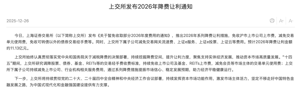 【环球网财经综合报道】12月26日,上海证券交易所与深圳证券交易所同步发布2026年系列降费让利措施,涵盖上市、交易、服务等多个环节。两所预计, 2026年合计降费让利金额将超过19亿元,以切实举措降低市场主体成本,激发市场活力。 具体来看,上交所发布的措施包括免收沪市上市公司上市费,减免交易单元使用费,免收除可转债外的债券交易经手费等。同时,上交所下属子公司将减免 交易网关流速费、上证e服务、上证e投票、上证云等相关费用。预计2026年上交所降费让利金额约11.13亿元。 一直以来,沪深交易所认真贯彻落实党中央、国务院有关减税降费的决策部署,持续挖掘降费空间,提升让利力度。 "十四五"期间,上交所研究调降股票、债券、基金、REITs等产品的交易经手费收费标准,持续免收上市公司及基金、REITs上市费,减免会员等市场主体的 交易单元使用费;上交所下属子公司持续减免上市公司和行业机构相关服务费用。 近年来,深交所先后调降基金、股票等产品交易经手费收费标准,连续多年免收基金上市费和流量费,免收相关债券产品融资交易费用,免收上市公司上市 费、减免网络投票服务费等,并指导下属子公司持续减免行业机构交易通信等费用。 深 ...